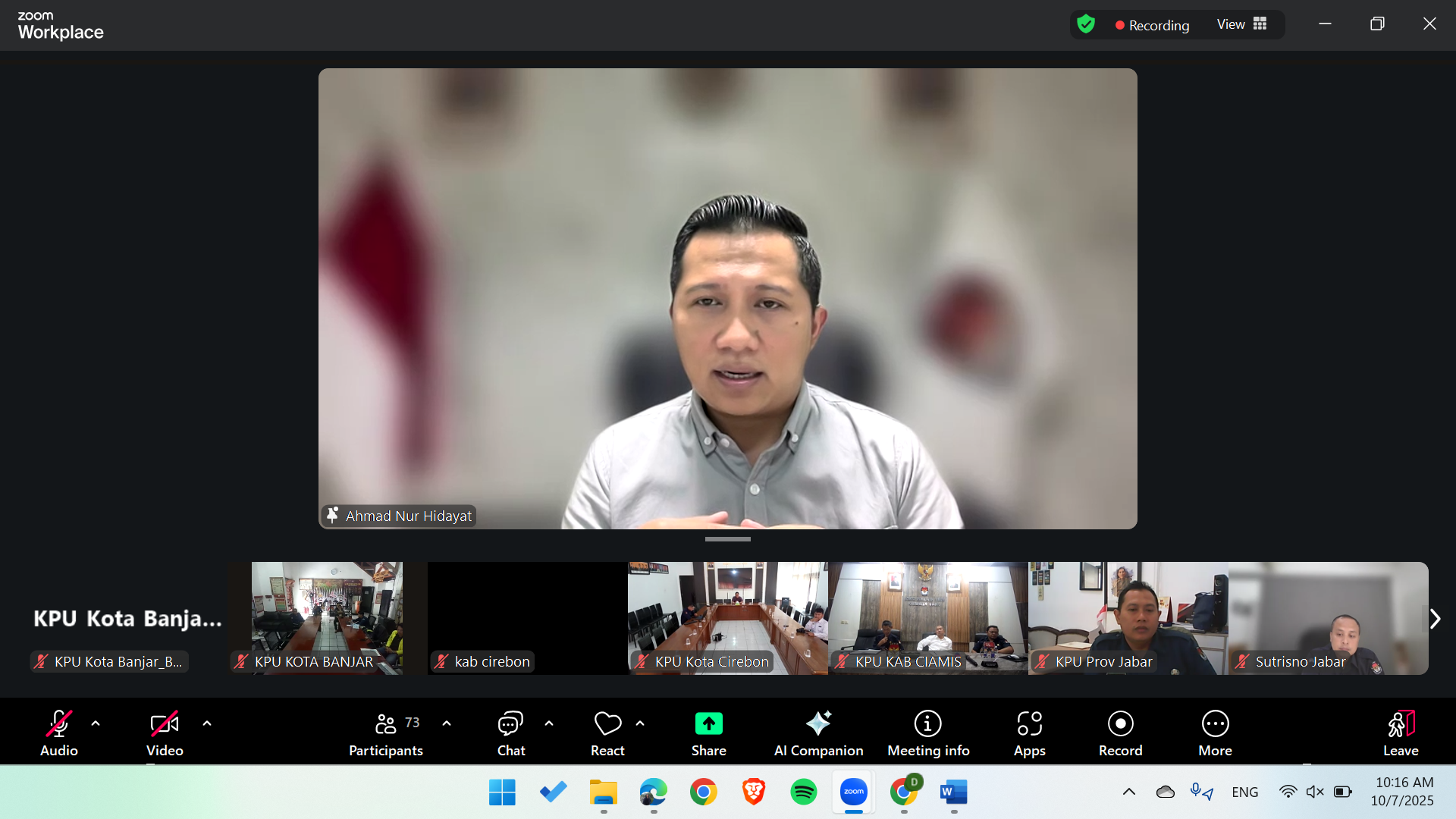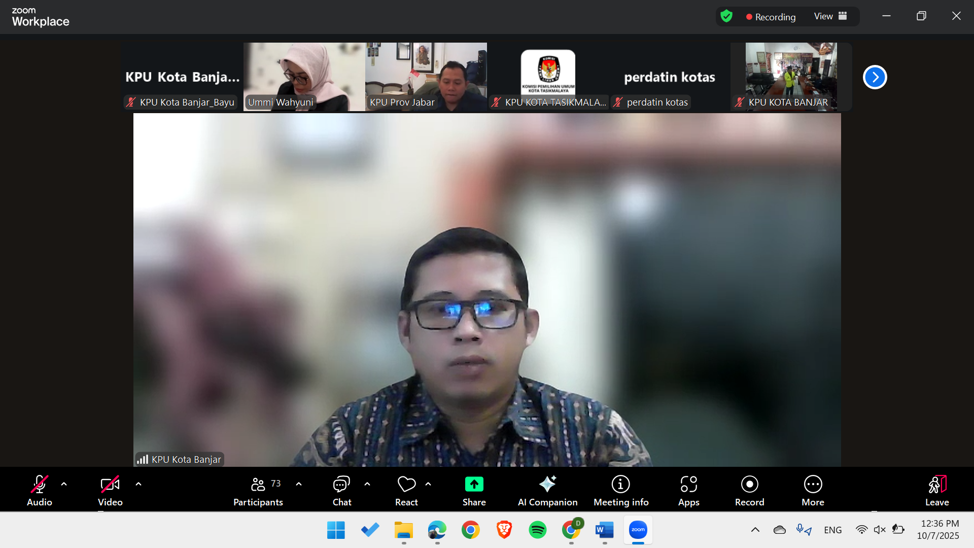 Banjar, 7 Oktober 2025 – Dalam rangka mengoptimalkan pelaksanaan Pemutakhiran Data Pemilih Berkelanjutan (PDPB) menjelang akhir tahun 2025, Komisi Pemilihan Umum (KPU) Kota Banjar mengikuti Rapat Koordinasi (Rakor) Data dan Informasi (Datin) PDPB Triwulan IV yang diselenggarakan oleh KPU Provinsi Jawa Barat. Kegiatan tersebut berlangsung secara daring melalui platform Zoom Meetings pada Selasa, 7 Oktober 2025, mulai pukul 10.12 WIB, dan diikuti oleh seluruh KPU kabupaten/kota se-Jawa Barat.