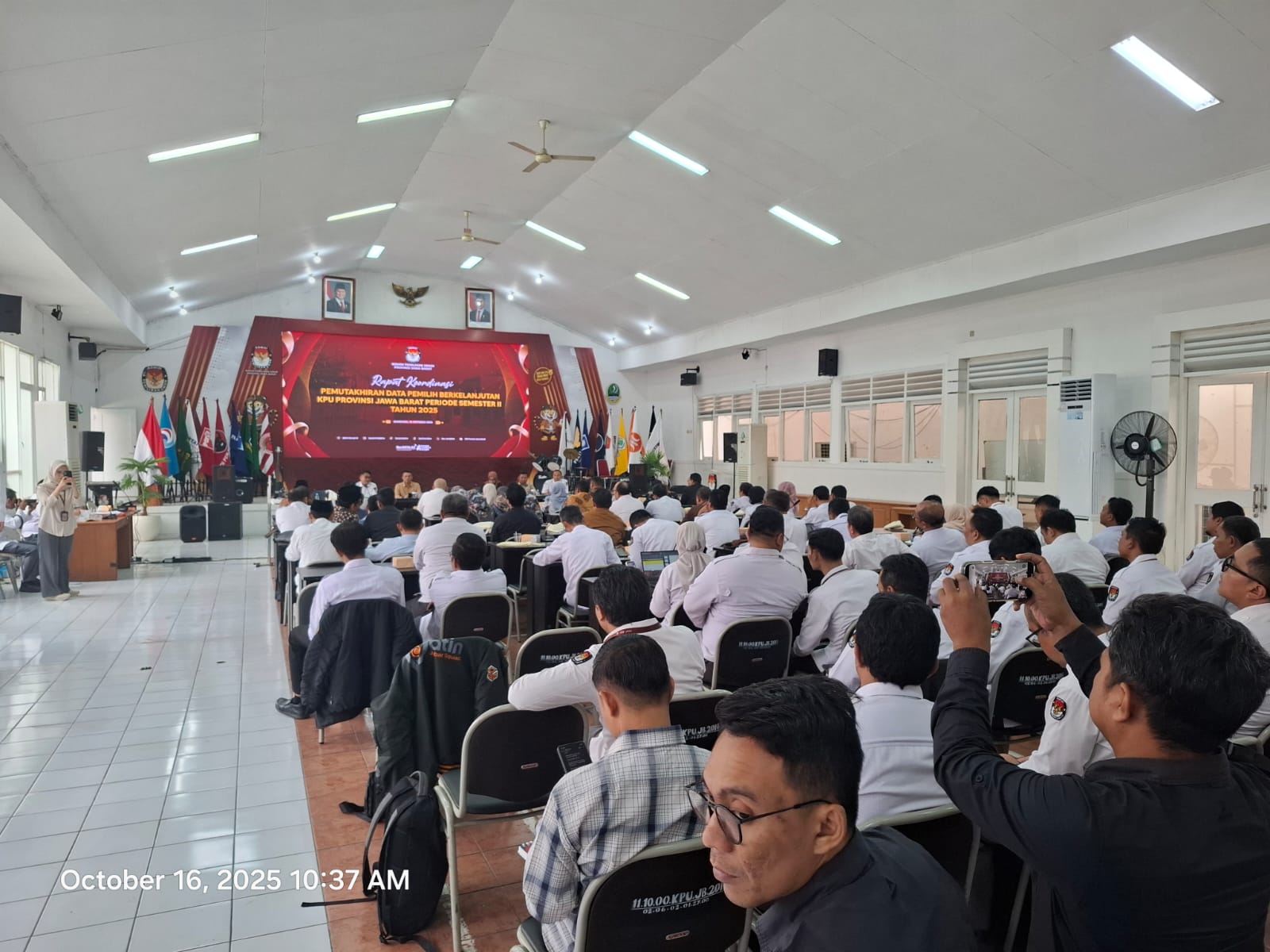 Kota Bandung, 16 Oktober 2025 – Komisi Pemilihan Umum (KPU) Provinsi Jawa Barat menyelenggarakan Rapat Koordinasi KPU se-Provinsi Jawa Barat Periode Semester II Tahun 2025 tentang Pemutakhiran Data Pemilih Berkelanjutan (PDPB) pada Kamis, 16 Oktober 2025, bertempat di Aula Setia Permana, KPU Provinsi Jawa Barat. Kegiatan ini diikuti oleh seluruh jajaran KPU kabupaten/kota se-Jawa Barat, dengan menghadirkan narasumber dari unsur penyelenggara pemilu dan mitra strategis, seperti Bawaslu Provinsi Jawa Barat, Dinas Kependudukan dan Pencatatan Sipil (Disdukcapil), serta lembaga pemerhati kepemiluan.