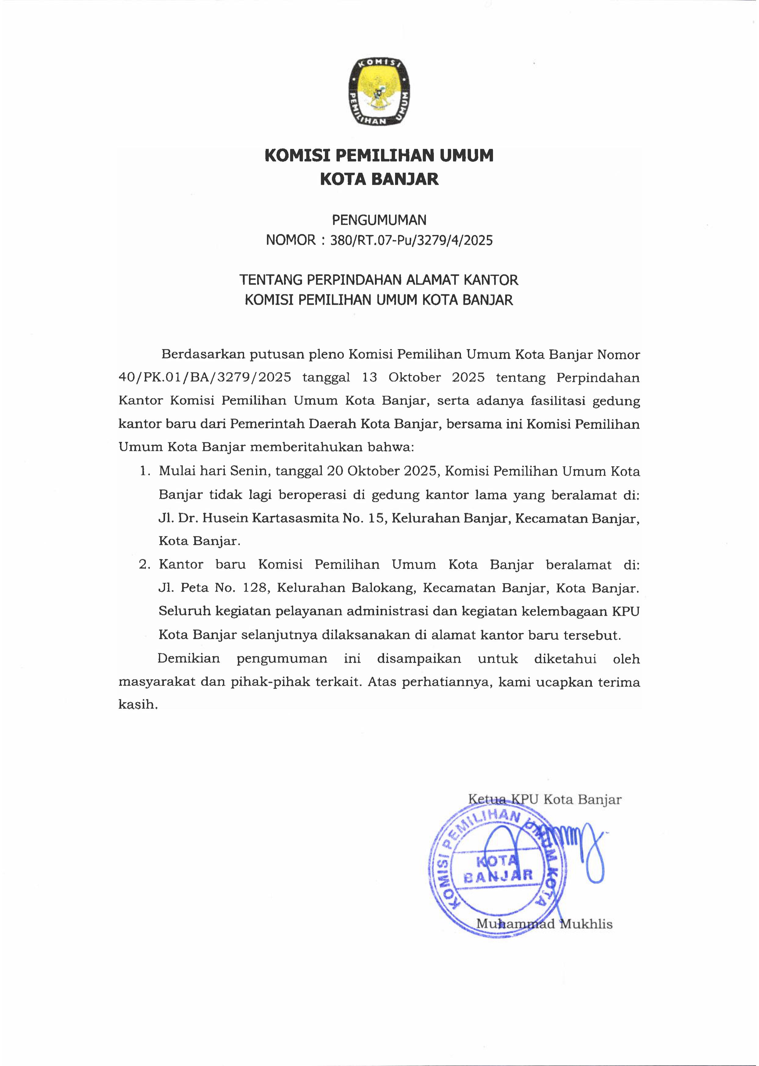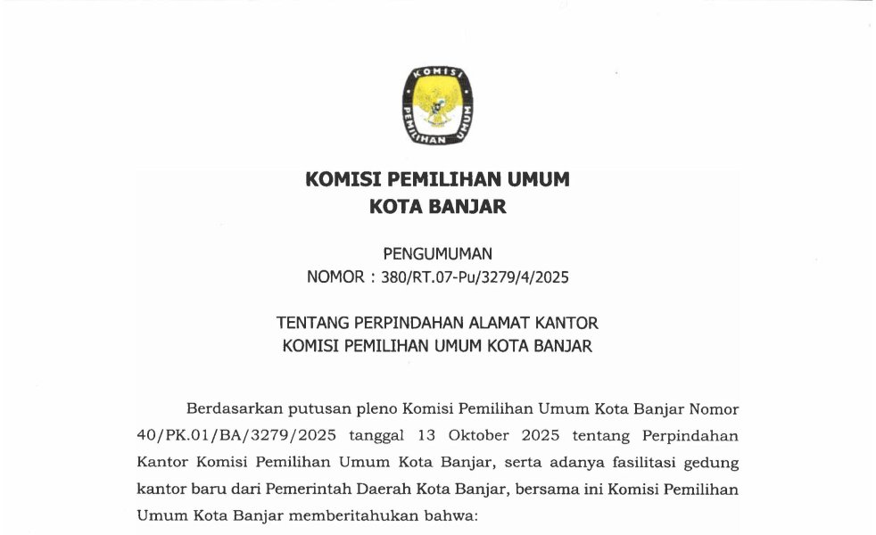 Berikut Pengumuman Nomor 380/RT.07-Pu/3279/4/2025 Tentang Perpindahan Alamat Kantor Komisi Pemilihan Umum Kota Banjar