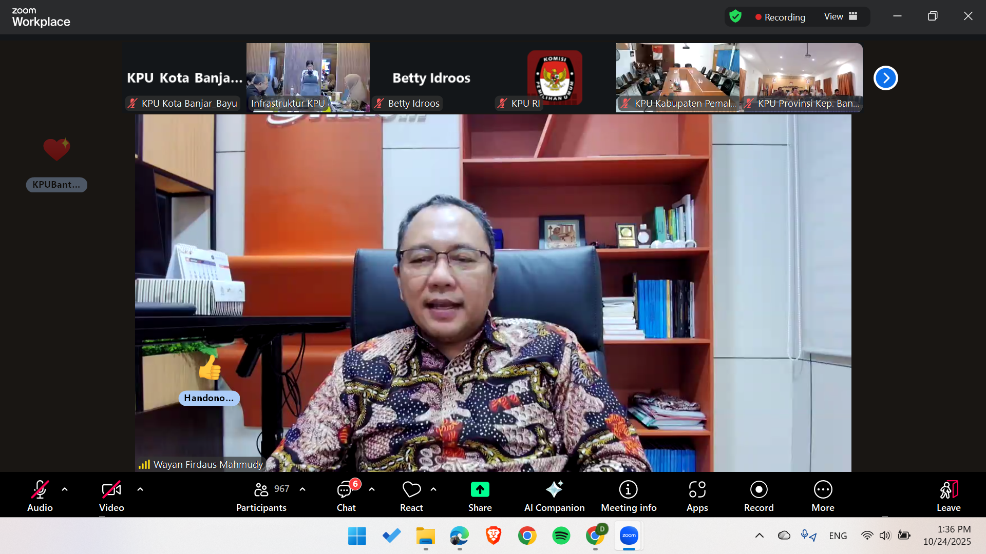 Banjar, 24 Oktober 2025 – Komisi Pemilihan Umum (KPU) Republik Indonesia kembali menghadirkan inovasi dalam peningkatan kapasitas sumber daya manusia melalui penyelenggaraan webinar bertajuk “Membangun Masa Depan Pemilu dengan AI: Kolaborasi, Inovasi, dan Efisiensi” yang digelar secara daring pada Jumat (24/10/2025) melalui platform Zoom Cloud Meetings. Kegiatan ini menjadi wadah pembelajaran sekaligus ruang refleksi bagi jajaran penyelenggara pemilu di seluruh Indonesia untuk memahami potensi kecerdasan buatan (AI) dalam mendukung efektivitas dan efisiensi alur kerja kelembagaan.
