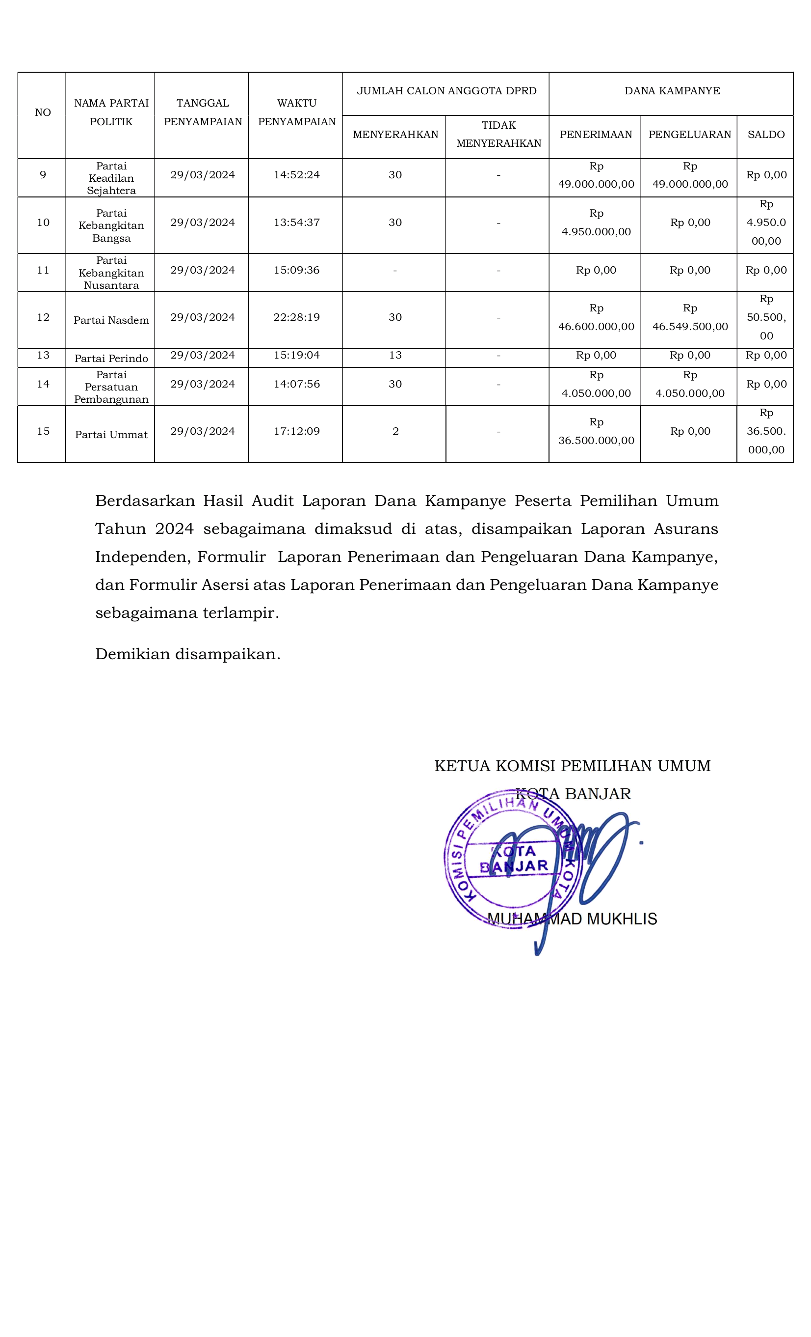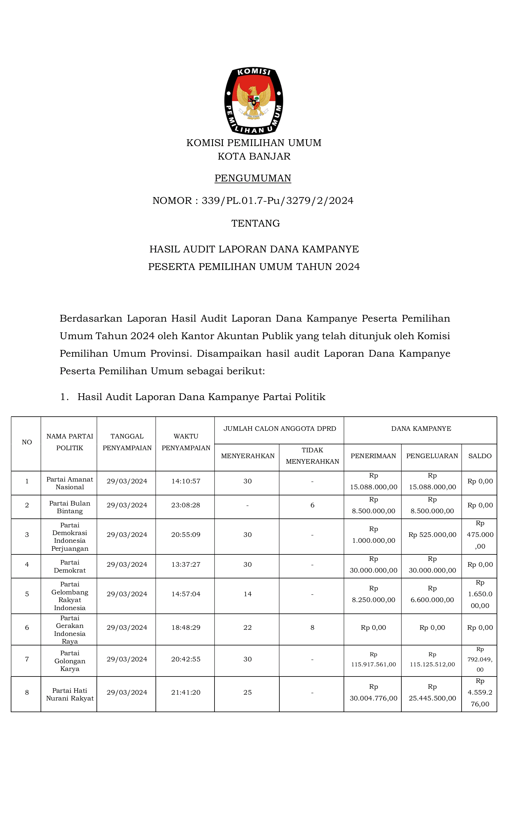 Berdasarkan Laporan Hasil Audit Laporan Dana Kampanye Peserta Pemilihan Umum Tahun 2024 oleh Kantor Akuntan Publik yang telah ditunjuk oleh Komisi Pemilihan Umum Provinsi. Disampaikan hasil audit Laporan Dana Kampanye Peserta Pemilihan Umum sebagai berikut: