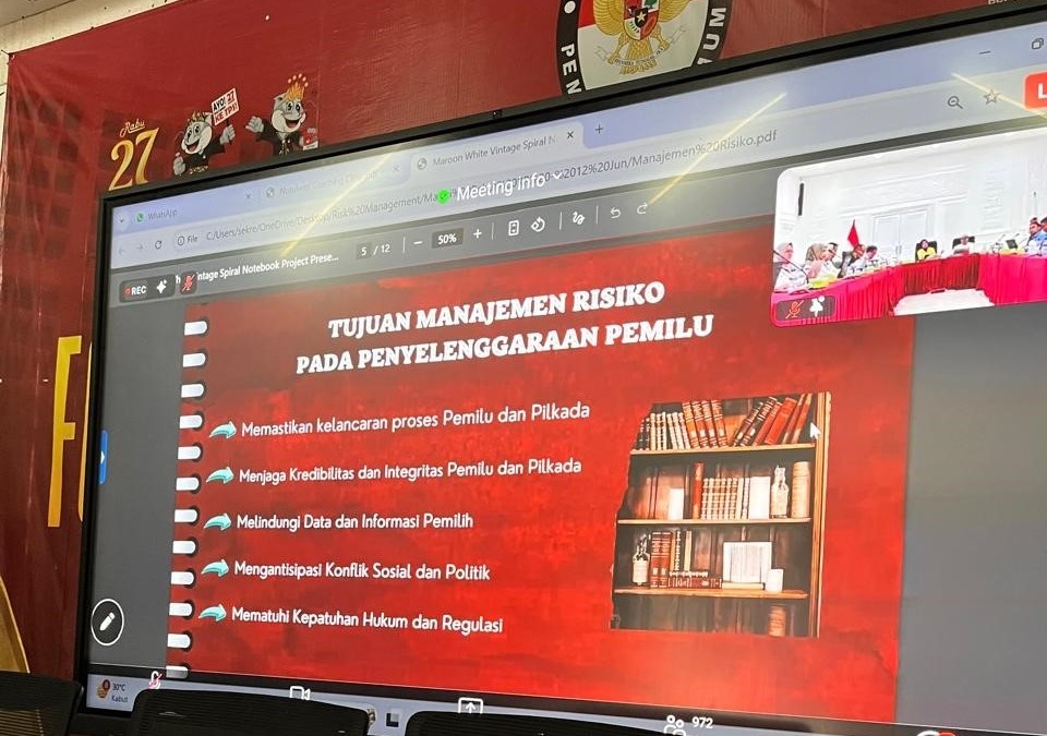 Banjar, 12 Juni 2025 – Divisi Hukum dan Pengawasan Komisi Pemilihan Umum (KPU) Republik Indonesia dan Badan Pemeriksa Keuangan dan Pembangunan (BPKP) menyelenggarakan Rapat Koordinasi Implementasi Manajemen Risiko dan Pendampingan Penyusunan Risk Register / Daftar Risiko Tahun 2025 secara daring. Tujuan Manajemen Risiko pada penyelenggaraan pemilu agar memastikan kelancaran proses Pemilu dan Pilkada, menjaga kredibilitas dan integritas pemilu dan pilkada, melindungi data dan informasi pemilih, mengantisipasi konflik sosial dan politik, dan mematuhi kepatuhan hukum dan regulasi.