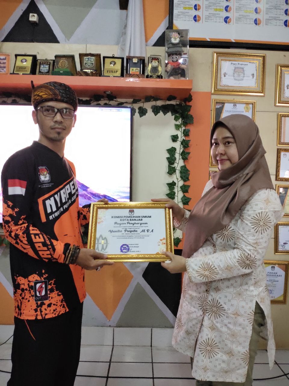 setelah itu, acara dilanjut dengan pemberian cinderamata dan pemutaran video persembahan yang telah dibuat oleh tim kreatif KPU Kota Banjar. (RSNUH)