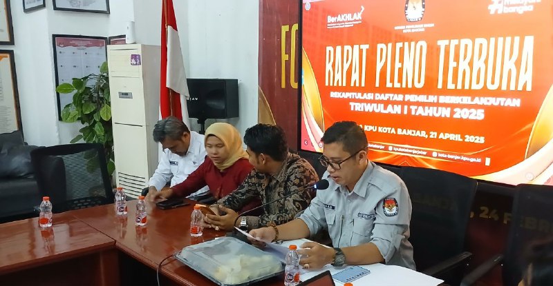 Kota Banjar, 21 April 2025 – Sebagai bagian dari komitmen untuk menjaga akurasi dan integritas data pemilih, Komisi Pemilihan Umum (KPU) Kota Banjar menyelenggarakan Rapat Pleno Terbuka Rekapitulasi Daftar Pemilih Berkelanjutan (DPB) Triwulan I Tahun 2025. Kegiatan ini digelar pada hari Senin, 21 April 2025, bertempat di Aula KPU Kota Banjar, dan dihadiri oleh perwakilan dari instansi pemerintah, Bawaslu, serta stakeholder terkait. Penyelenggaraan rapat pleno ini dilaksanakan berdasarkan amanat Pasal 19 ayat (2) Peraturan Komisi Pemilihan Umum Nomor 1 Tahun 2025 tentang Pemutakhiran Data Pemilih Berkelanjutan, yang mengatur bahwa rekapitulasi dilakukan melalui rapat pleno terbuka paling singkat setiap 3 (tiga) bulan sekali. Pleno terbuka ini menjadi wadah evaluasi sekaligus penetapan data pemilih terbaru hasil pemutakhiran yang dilakukan secara berkala, sebagai upaya KPU untuk memastikan setiap warga negara yang memenuhi syarat dapat menggunakan hak pilihnya pada pemilu mendatang.