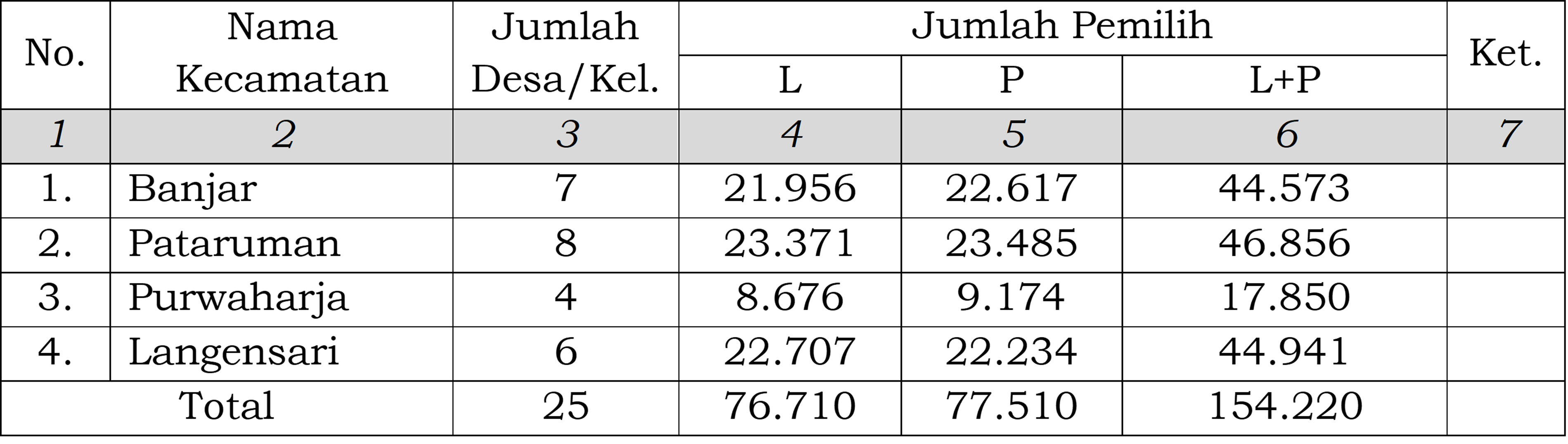 Berdasarkan data Rekapitulasi di atas, jumlah pemilih laki-laki tercatat sebanyak 76.710, sedangkan pemilih perempuan mencapai 77.510, dengan total keseluruhan pemilih sebanyak 154.220. Perbandingan jumlah pemilih laki-laki dan perempuan menunjukkan bahwa pemilih perempuan sedikit lebih banyak, dengan selisih 800 pemilih atau sekitar 0,5%. Rasio antara pemilih laki-laki dan perempuan adalah sekitar 0,99:1, yang menunjukkan bahwa jumlah pemilih kedua jenis kelamin ini hampir seimbang. Data ini memberikan gambaran yang cukup proporsional tentang distribusi pemilih di Kota Banjar pada periode ini, di mana perbedaan jumlah pemilih laki-laki dan perempuan relatif kecil, mencerminkan keterwakilan yang adil bagi keduanya dalam proses pemutakhiran data pemilih.