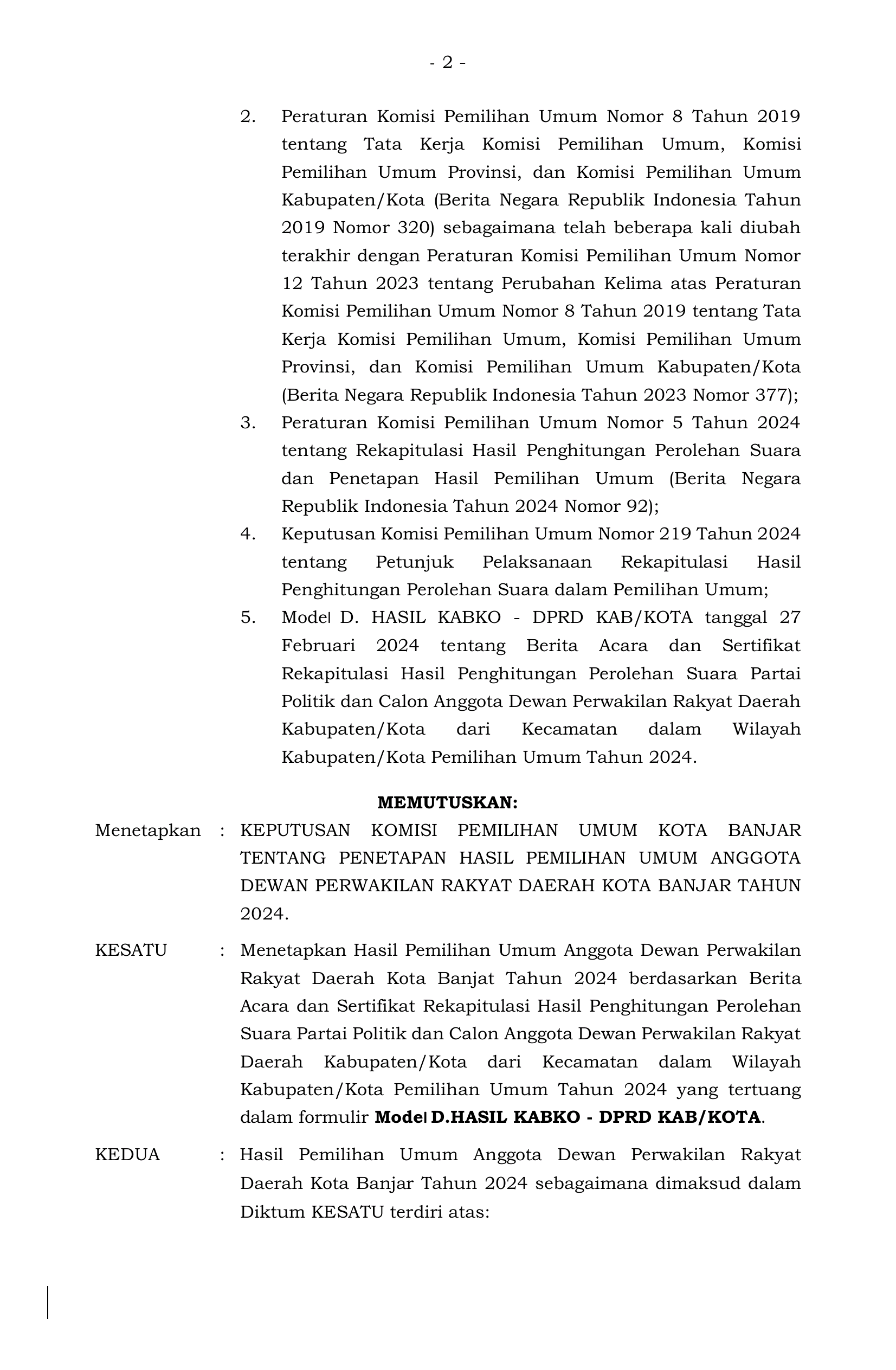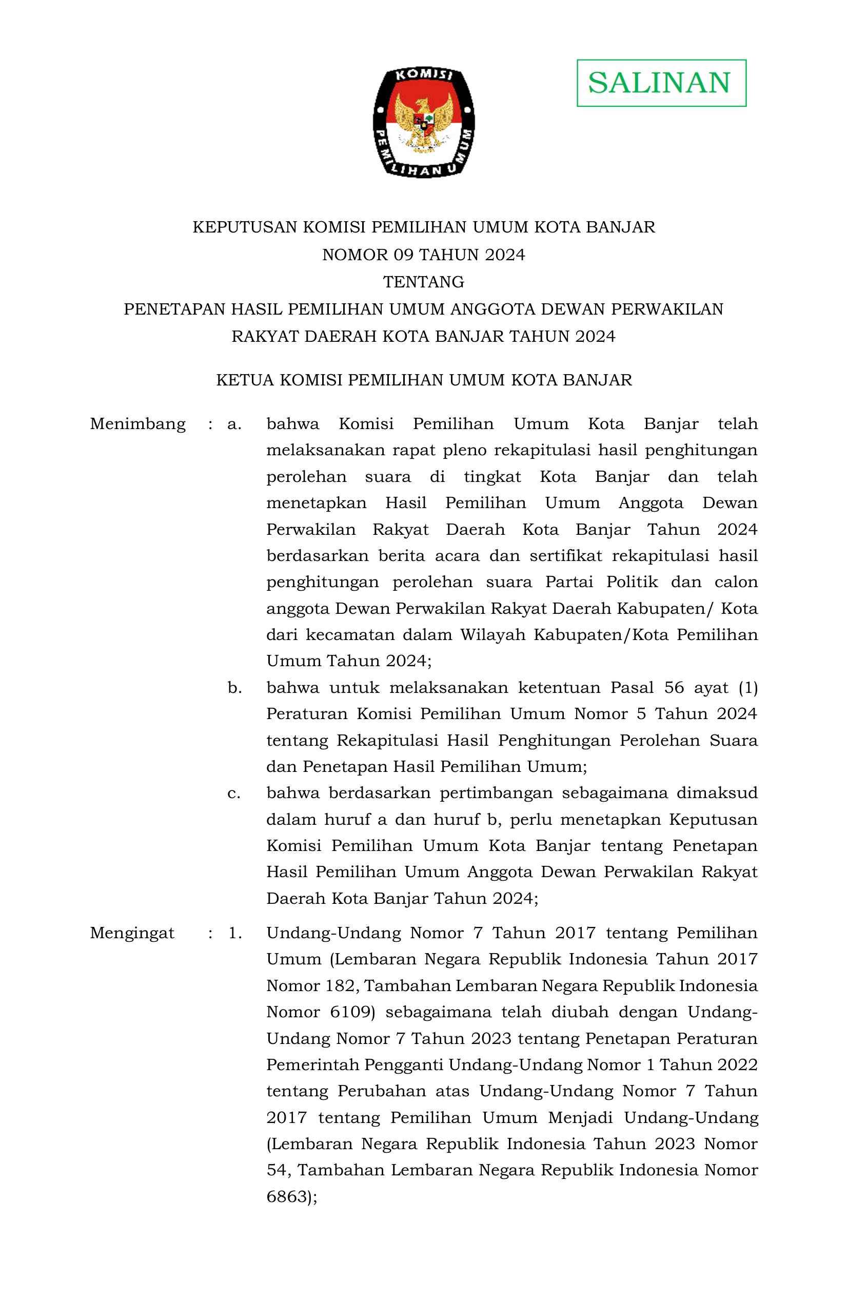 Berikut Ini Keputusan Komisi Pemilihan Umum Kota Banjar Nomor 09 Tahun 2024 Tentang Penetapan Hasil Pemilihan Umum Anggota Dewan Perwakilan Rakyat Daerah Kota Banjar Tahun 2024.