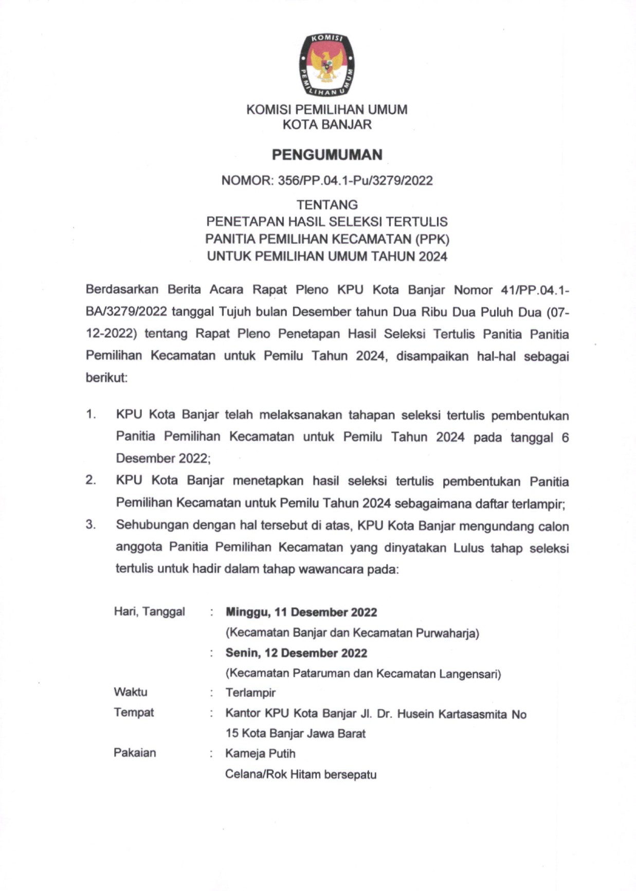 PENETAPAN HASIL SELEKSI TERTULIS PANITIA PEMILIHAN KECAMATAN (PPK) UNTUK PEMILIHAN UMUM TAHUN 2024