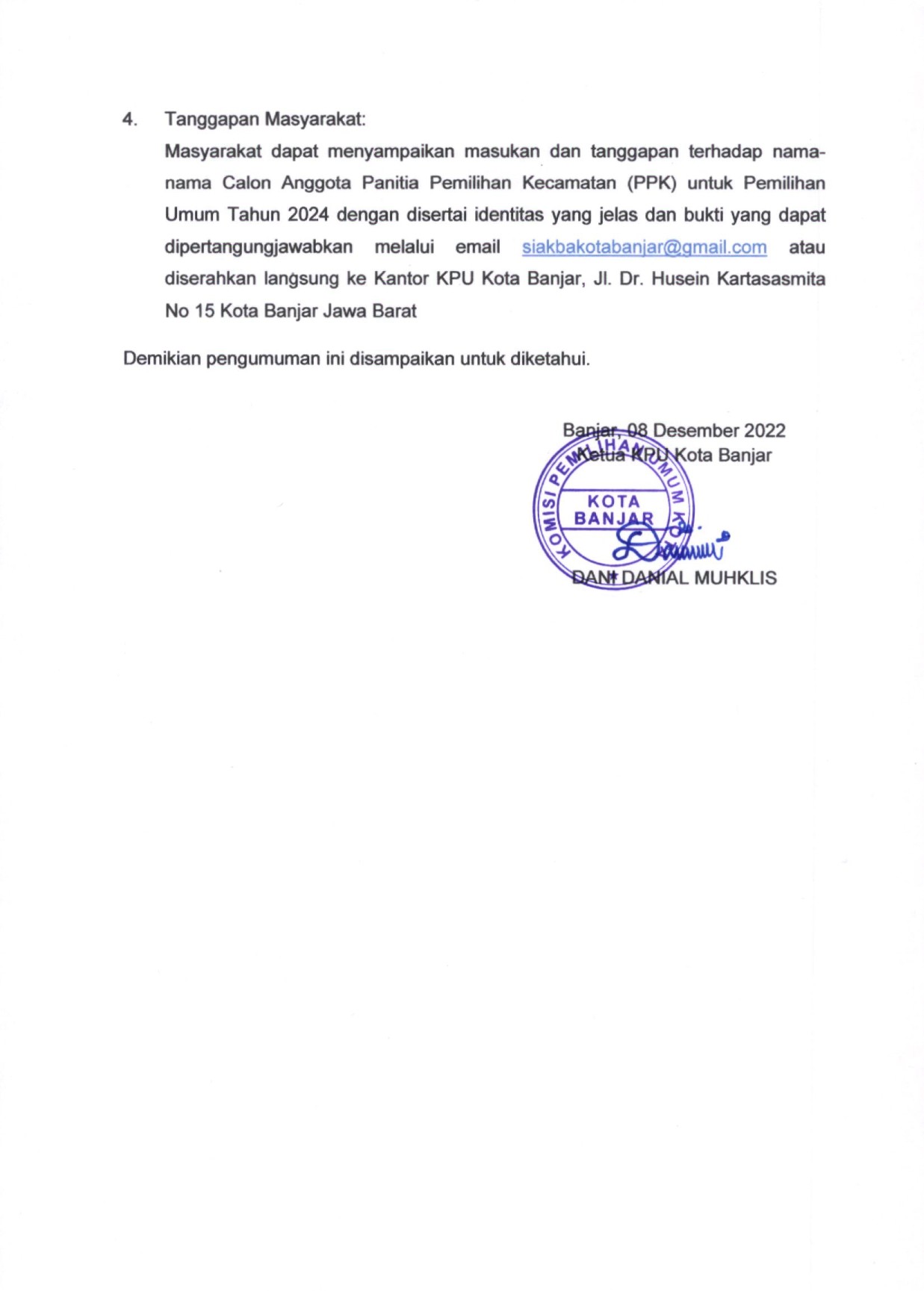 Berikut ini Hasil Seleksi tertulis Panitia Pemilihan Kecamatan (PPK) untuk Pemilihan Umum Tahun 2024