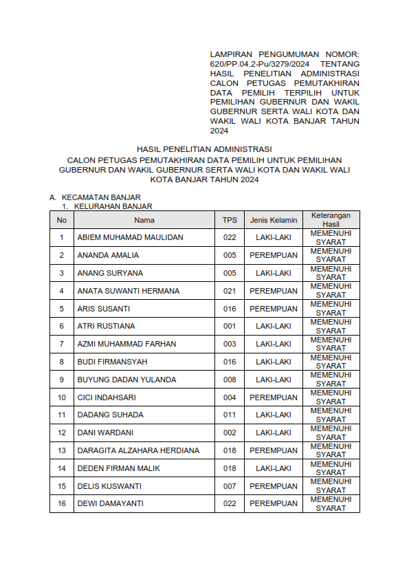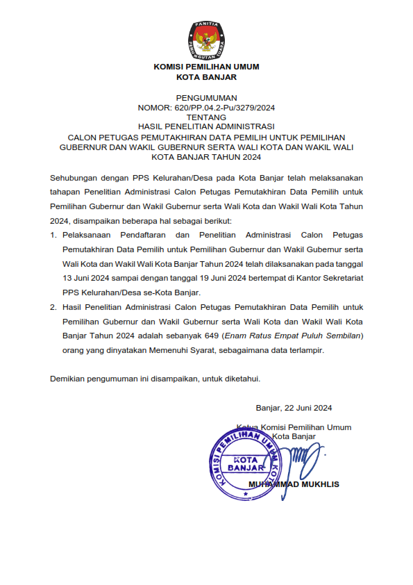 Berikut Pengumuman Nomor: 620/PP.04.2-Pu/3279/2024 Tentang Hasil Penelitian Administrasi Calon Petugas Pemutakhiran Data Pemilih Untuk Pemilihan Gubernur Dan Wakil Gubernur Serta Wali Kota Dan Wakil Wali Kota Banjar Tahun 2024.