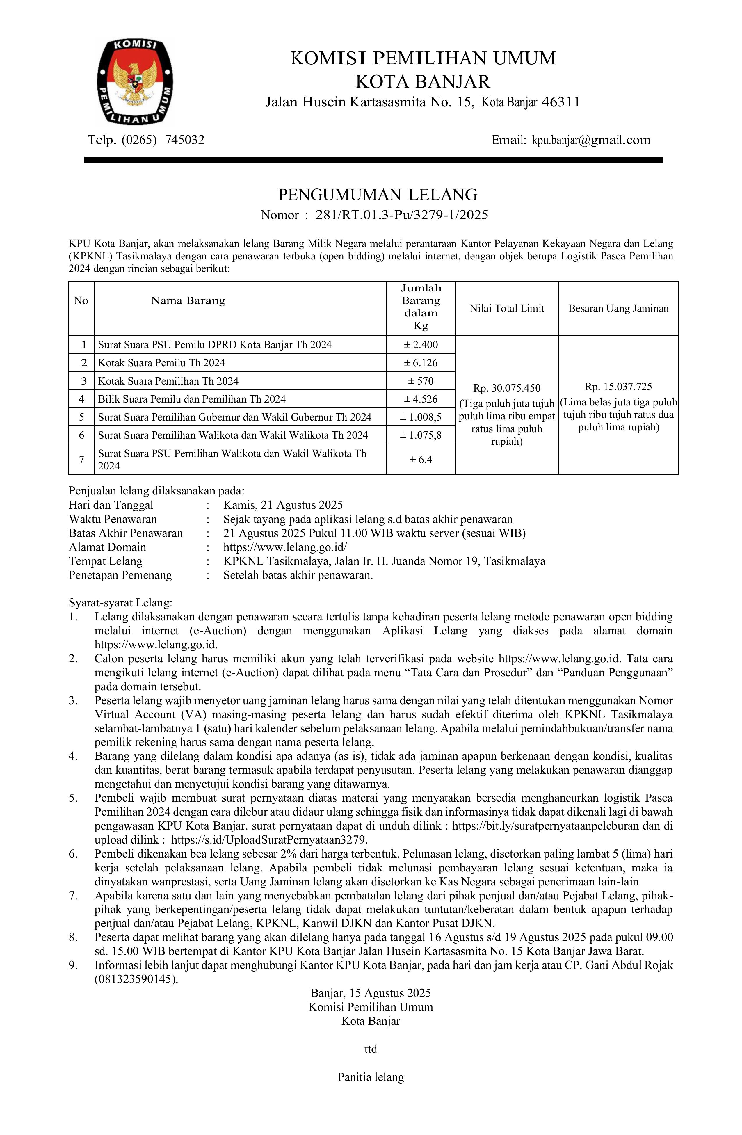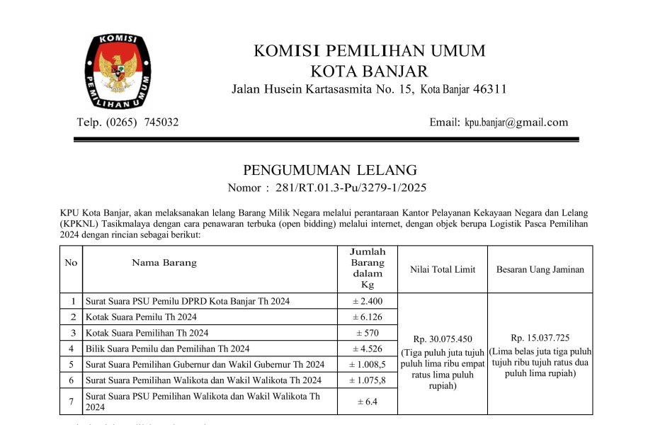 Berikut Pengumuman Nomor 281/RT.01.3-Pu/3279-1/2025 tentang Lelang Barang Milik Negara melalui perantaraan Kantor Pelayanan Kekayaan Negara dan Lelang (KPKNL) Tasikmalaya dengan cara penawaran terbuka (open bidding) melalui internet, dengan objek berupa Logistik Pasca Pemilihan 2024.