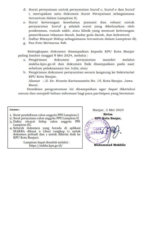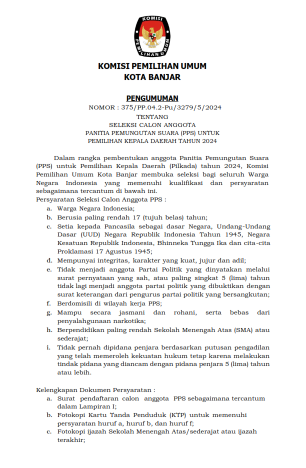 Dalam rangka pembentukan anggota Panitia Pemungutan Suara (PPS) untuk Pemilihan Kepala Daerah (Pilkada) tahun 2024, Komisi Pemilihan Umum Kota Banjar membuka seleksi bagi seluruh Warga Negara Indonesia yang memenuhi kualifikasi dan persyaratan sebagaimana tercantum di bawah ini.