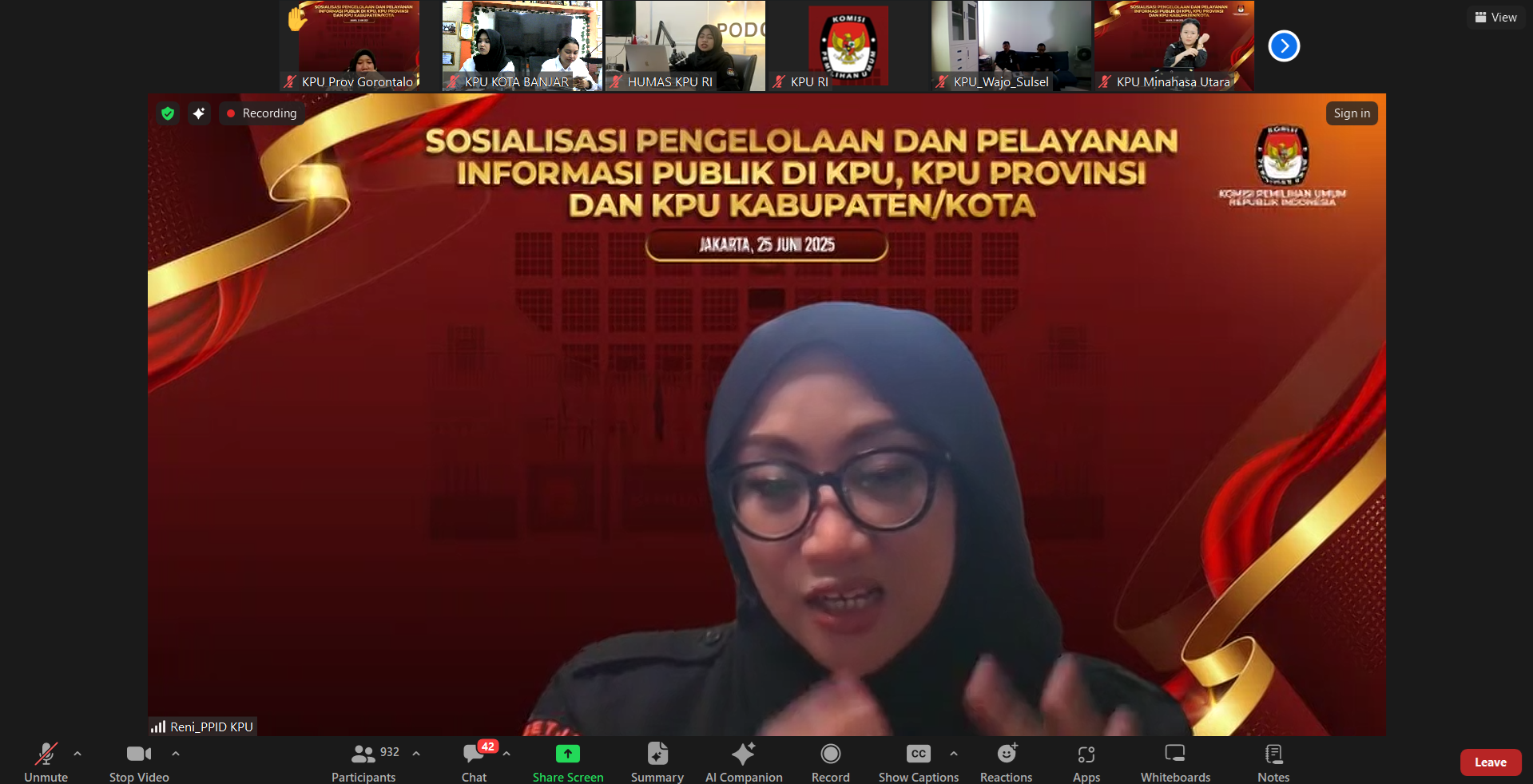 Banjar, 25 Juni 2025 – Komisi Pemilihan Umum (KPU) Kota Banjar turut serta dalam kegiatan sosialisasi Pejabat Pengelola Informasi dan Dokumentasi (PPID) yang diselenggarakan oleh KPU Republik Indonesia (KPU RI) pada Rabu, 25 Juni 2025. Acara yang dilaksanakan secara daring ini menghadirkan Ibu Reni Rinjani Kabag Humas dan Informasi sebagai pemateri pengelolaan dan pelayanan informasi publik di lingkungan KPU. Admin KPU RI, Yosara Latifa Mayasari dan Amirul Mukmin segabai pemateri teknis pengelolaan website e-PPID. Banjar, 25 Juni 2025 – Komisi Pemilihan Umum (KPU) Kota Banjar turut serta dalam kegiatan sosialisasi Pejabat Pengelola Informasi dan Dokumentasi (PPID) yang diselenggarakan oleh KPU Republik Indonesia (KPU RI) pada Rabu, 25 Juni 2025. Acara yang dilaksanakan secara daring ini menghadirkan Reni Rinjani Kabag Humas dan Informasi sebagai pemateri pengelolaan dan pelayanan informasi publik di lingkungan KPU. Admin KPU RI, Yosara Latifa Mayasari dan Amirul Mukmin segabai pemateri teknis pengelolaan website e-PPID.