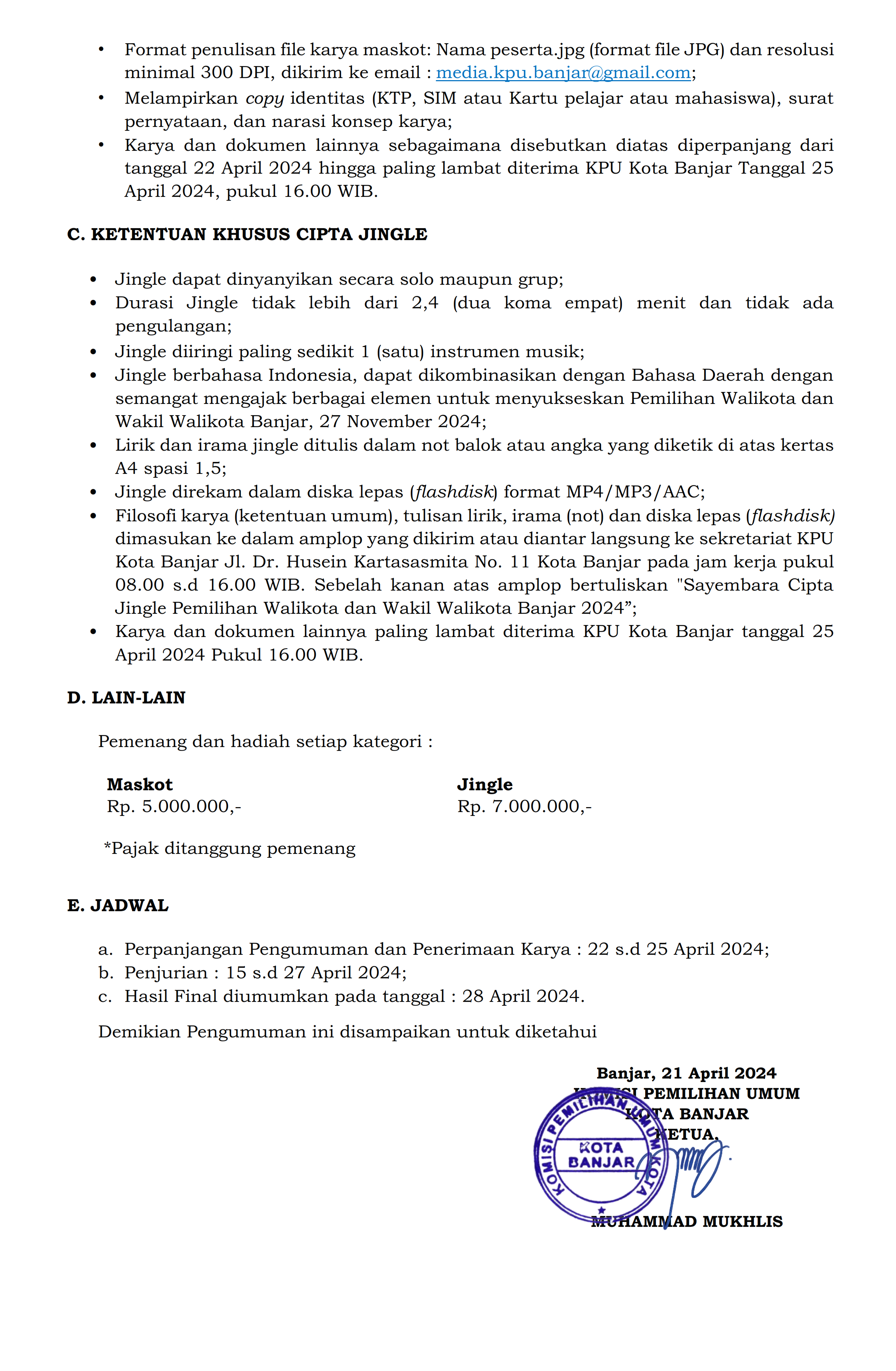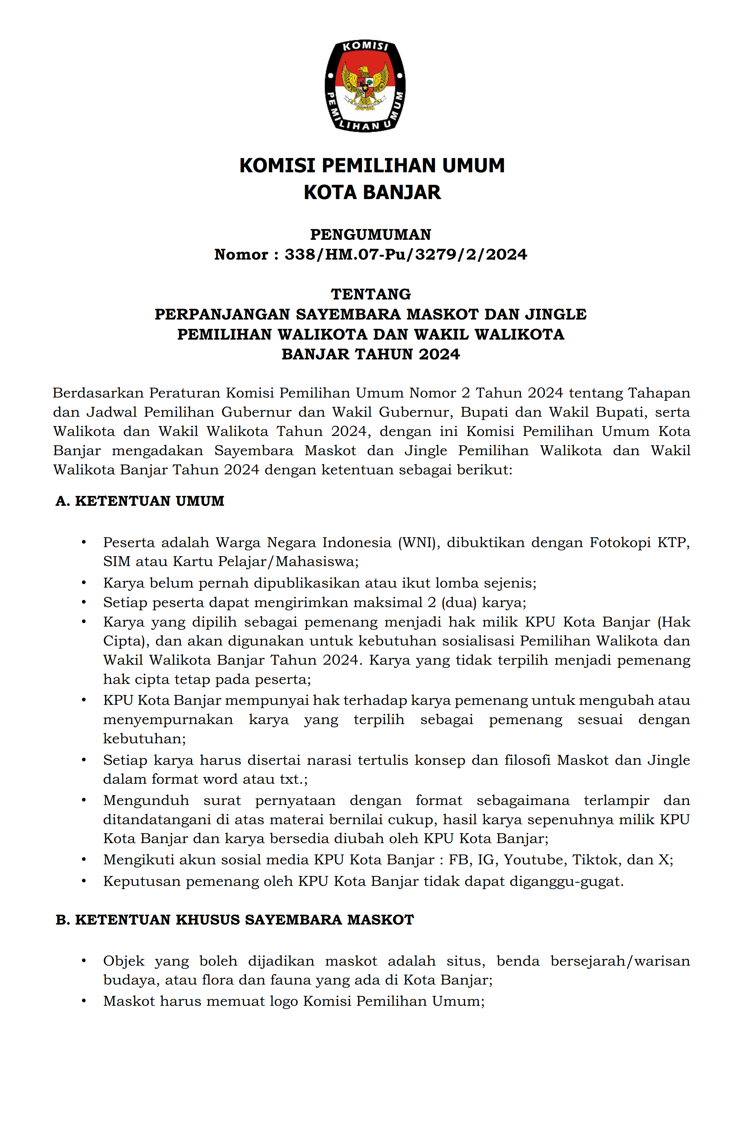 PERPANJANGAN SAYEMBARA MASKOT DAN JINGLE PEMILIHAN WALIKOTA DAN WAKIL WALIKOTA BANJAR TAHUN 2024