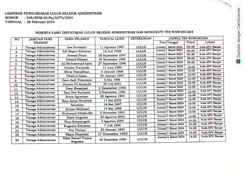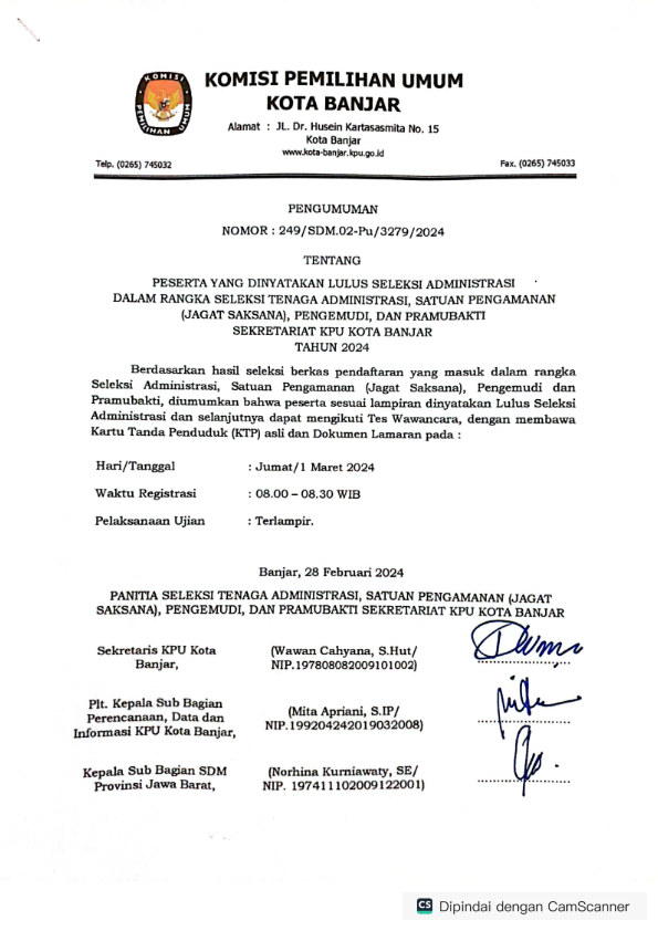 PESERTA YANG DINYATAKAN LULUS SELEKSI ADMINISTRASI SELEKSI TENAGA ADMINISTRASI, SATUAN PENGAMANAN (JAGAT SAKSANA), PENGEMUDI, DAN PRAMUBAKTI KPU KOTA BANJAR TAHUN 2024
