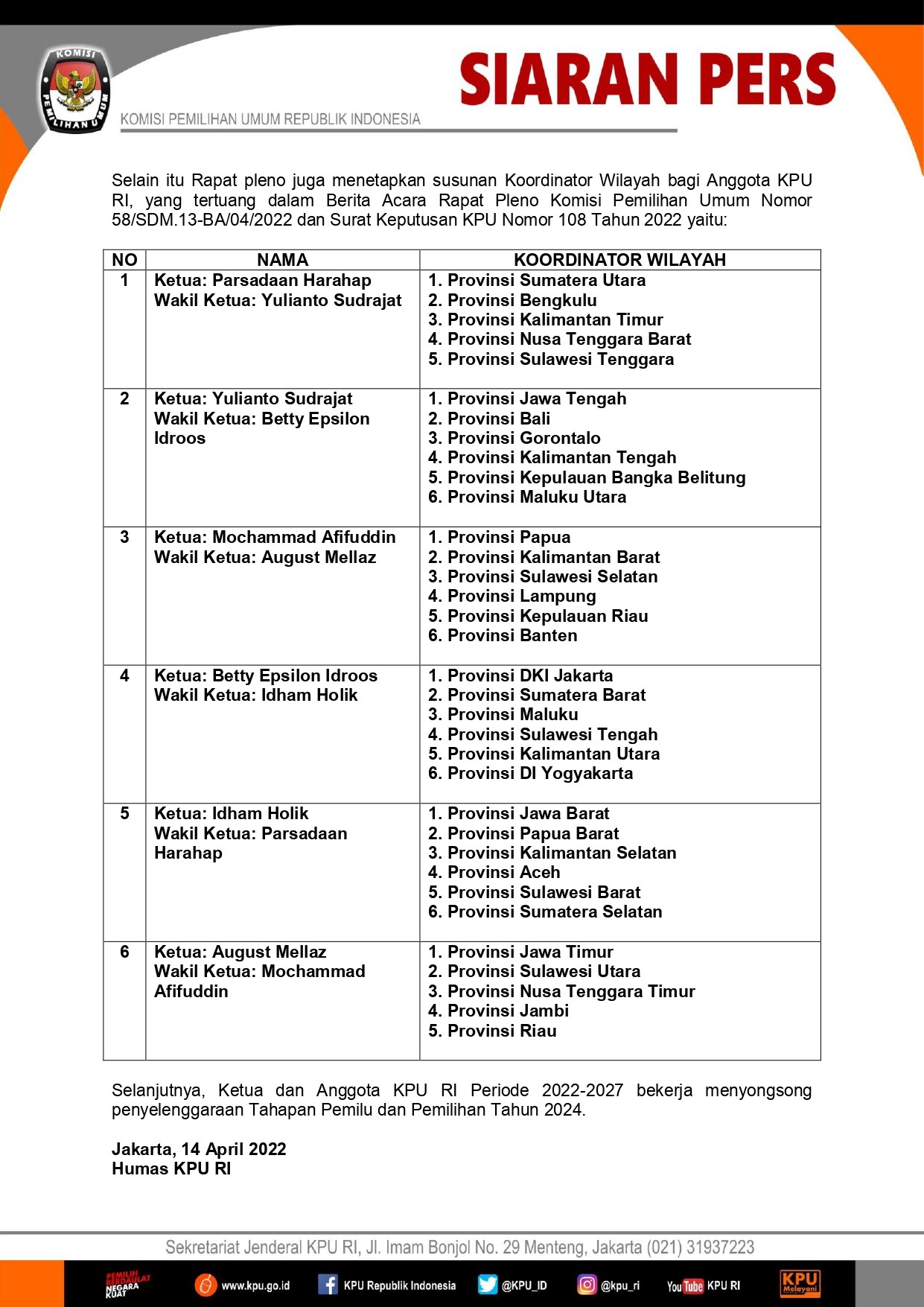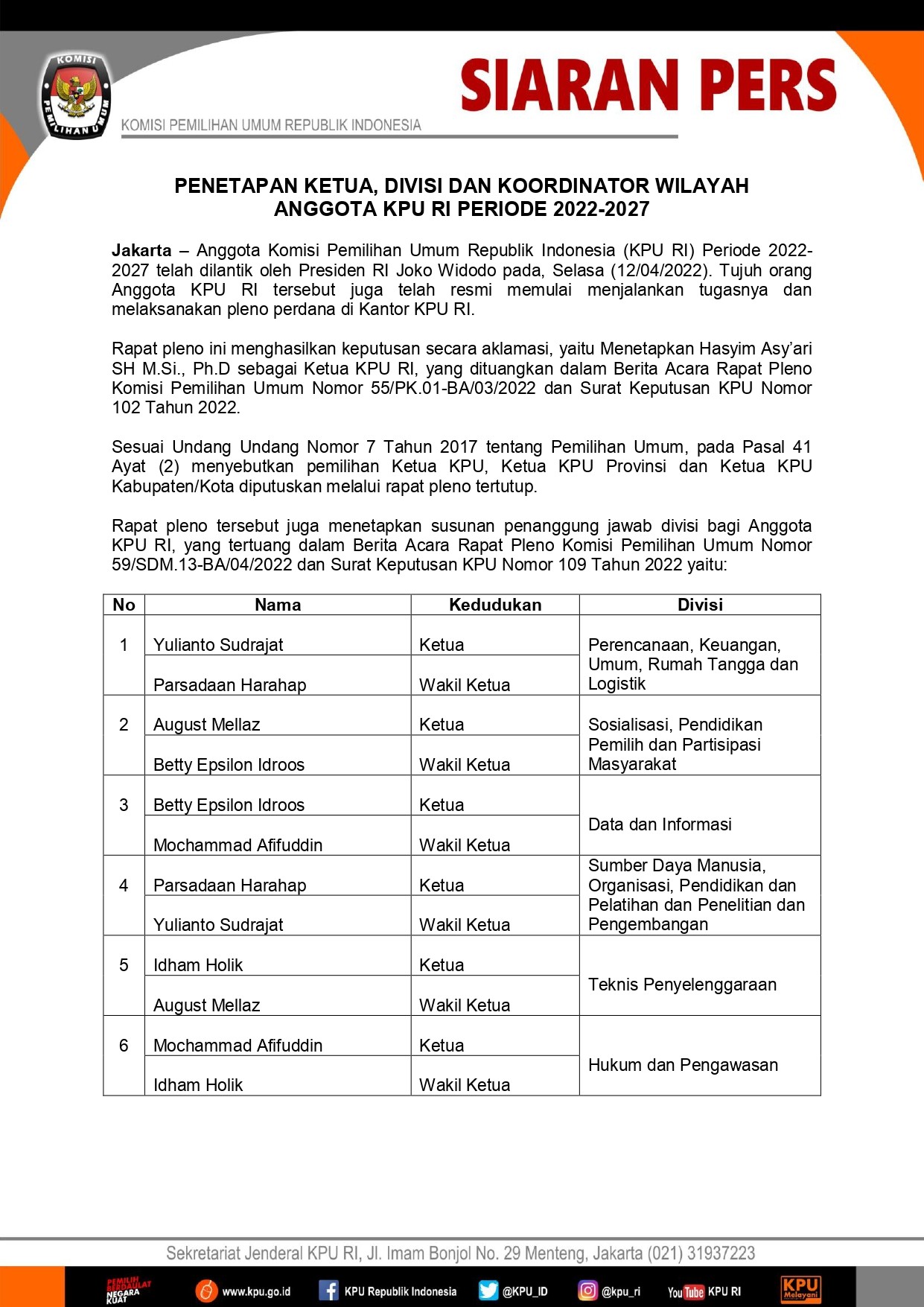 Siaran Pers Penetapan Ketua, Divisi dan Koordinator Wilayah Anggota KPU RI Periode 2022-2027 sesuai hasil pleno KPU RI tanggal 14 April 2022