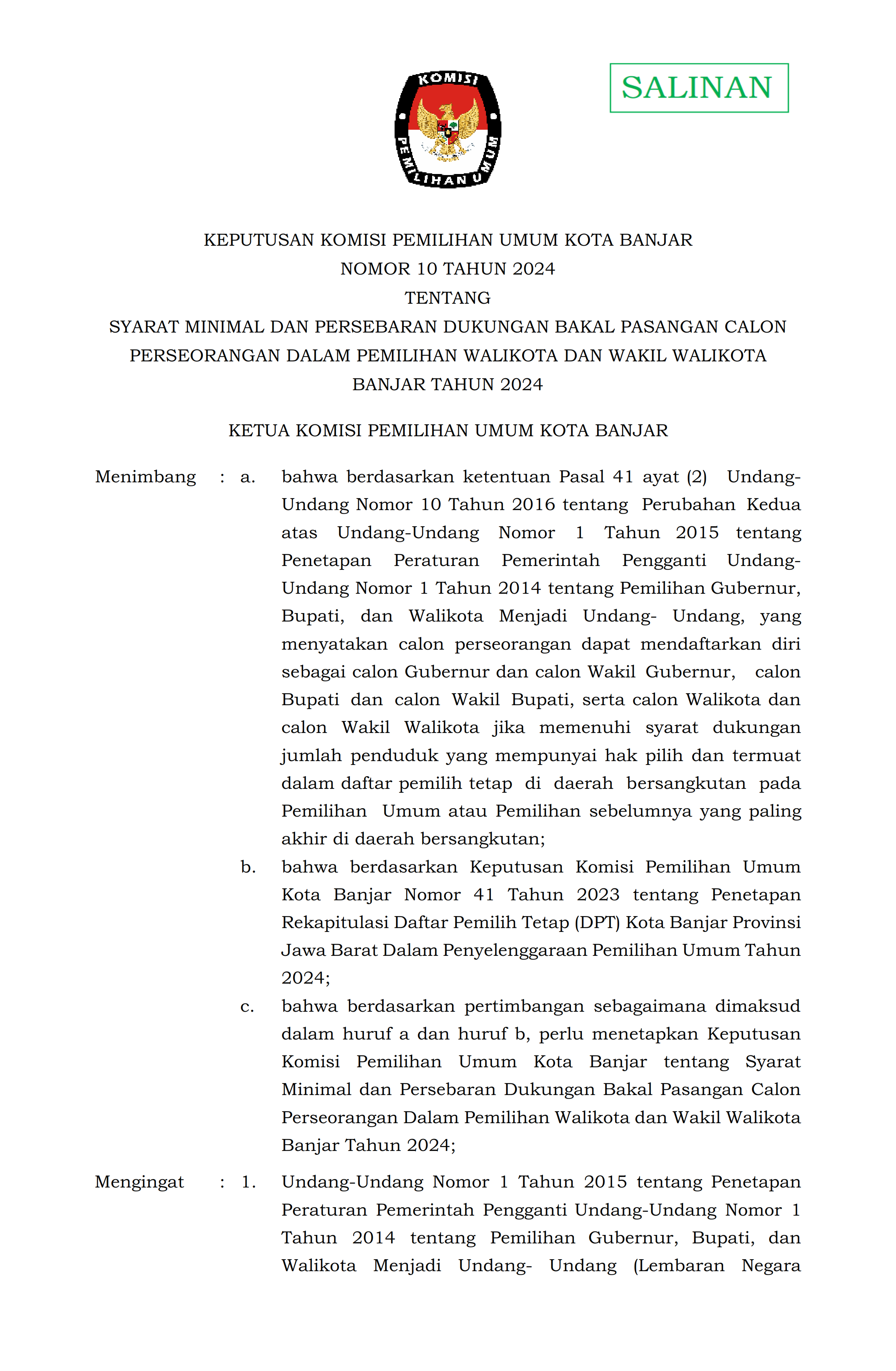 Berikut ini Keputusan Komisi Pemilihan Umum Kota Banjar Nomor 10 Tahun 2024 Tentang Syarat Minimal dan Persebaran Dukungan Bakal Pasangan Calon Perseorangan Dalam Pemilihan Walikota dan Wakil Walikota Banjar Tahun 2024.