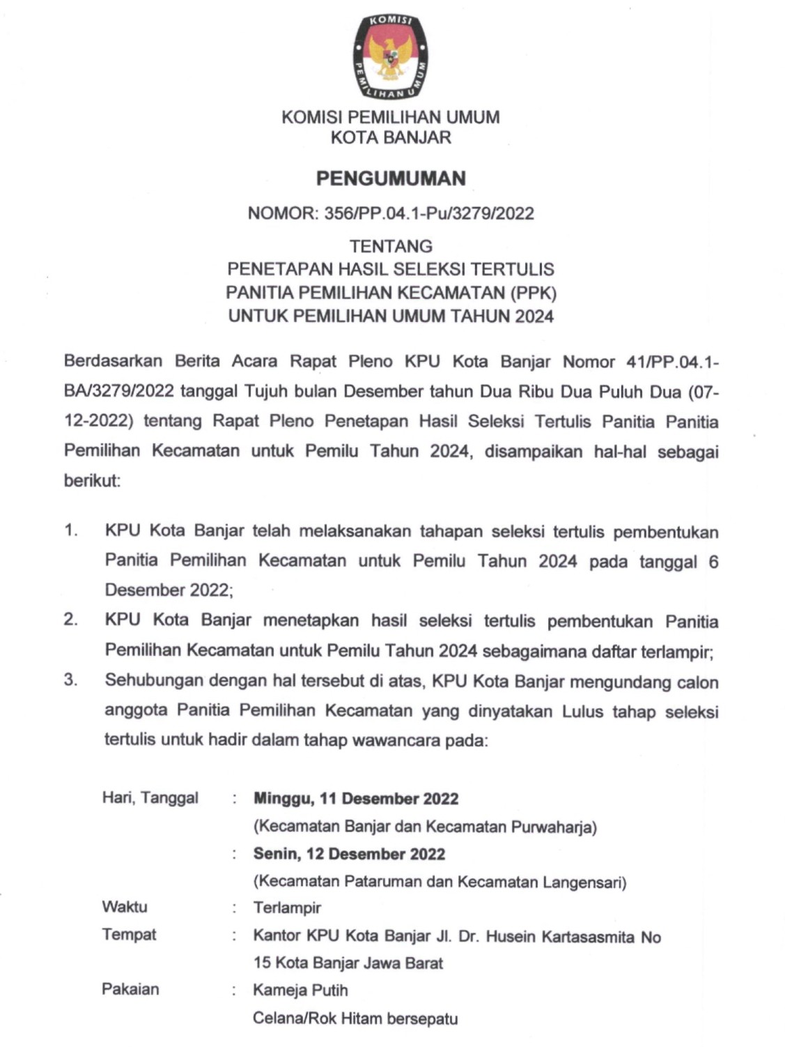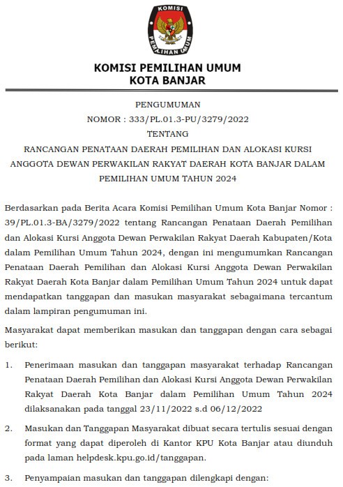 Berdasarkan pada Berita Acara Komisi Pemilihan Umum Kota Banjar Nomor : 39/PL.01.3-BA/3279/2022 tentang Penetapan Rancangan Penataan Daerah Pemilihan Dan Alokasi Kursi Anggota Dewan Perwakilan Rakyat Daerah Kota Banjar Dalam Pemilihan Umum Tahun 2024, dengan ini mengumumkan Rancangan Penataan Daerah Pemilihan dan Alokasi Kursi Anggota Dewan Perwakilan Rakyat Daerah Kota Banjar dalam Pemilihan Umum Tahun 2024 untuk dapat mendapatkan tanggapan dan masukan masyarakat sebagaimana tercantum dalam lampiran pengumuman ini. Masyarakat dapat memberikan masukan dan tanggapan dengan cara sebagai berikut: