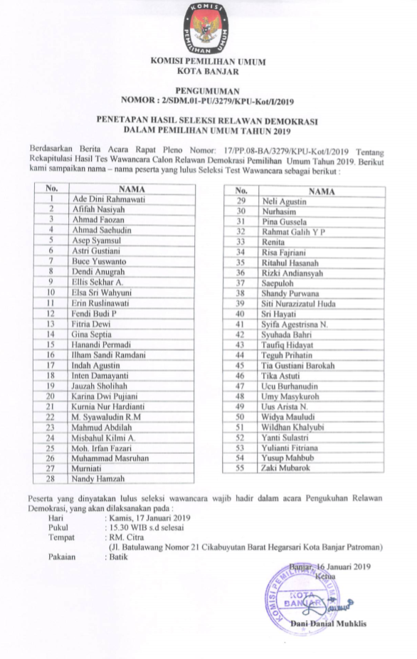 PENETAPAN HASIL SELEKSI RELAWAN DEMOKRASI PEMILU 2019 Jumat, 18 Januari 2019 00:00 39 PENETAPAN HASIL SELEKSI RELAWAN DEMOKRASI PEMILU 2019 Baca Selengkapnya