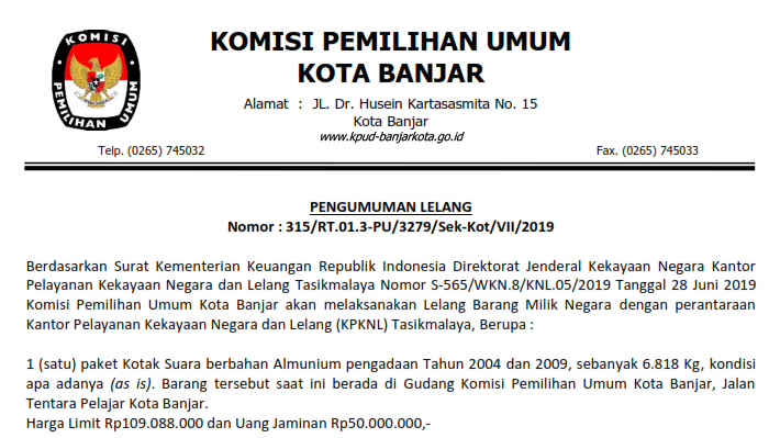 PENGUMUMAN LELANG KOTAK SUARA KPU BANJAR Jumat, 05 Juli 2019 00:00 43 PENGUMUMAN LELANG KPU BANJAR_REVISI Baca Selengkapnya