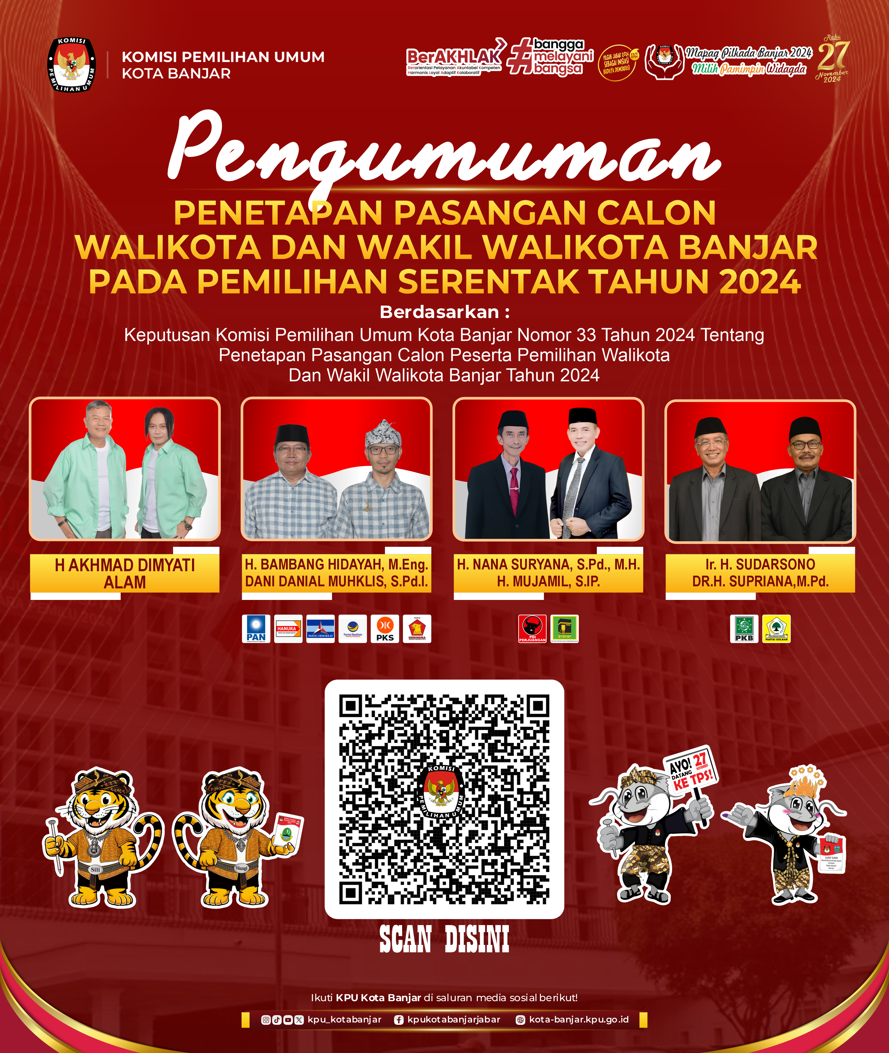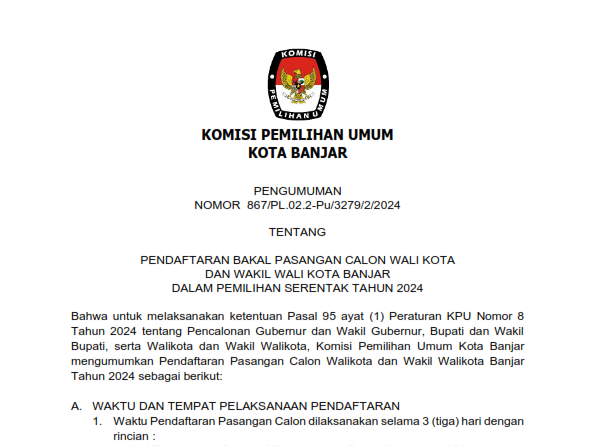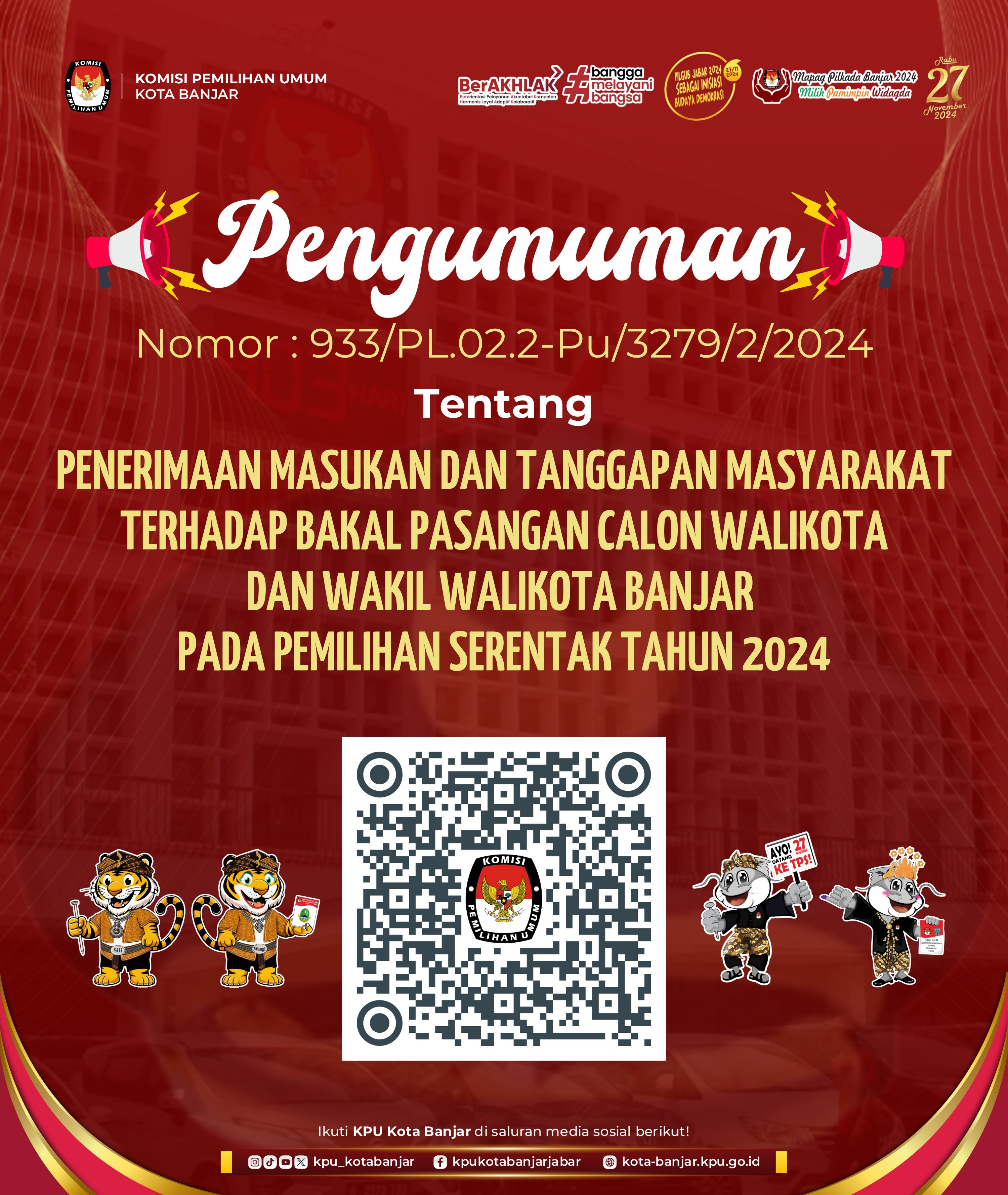 Berikut Pengumuman Nomor: 933/PL.02.2-Pu/3279/2/2024 Tentang Penerimaan Masukan dan Tanggapan Masyarakat terhadap Bakal Pasangan Calon Walikota dan Wakil Walikota Banjar Pada Pemilihan Serentak Tahun 2024.