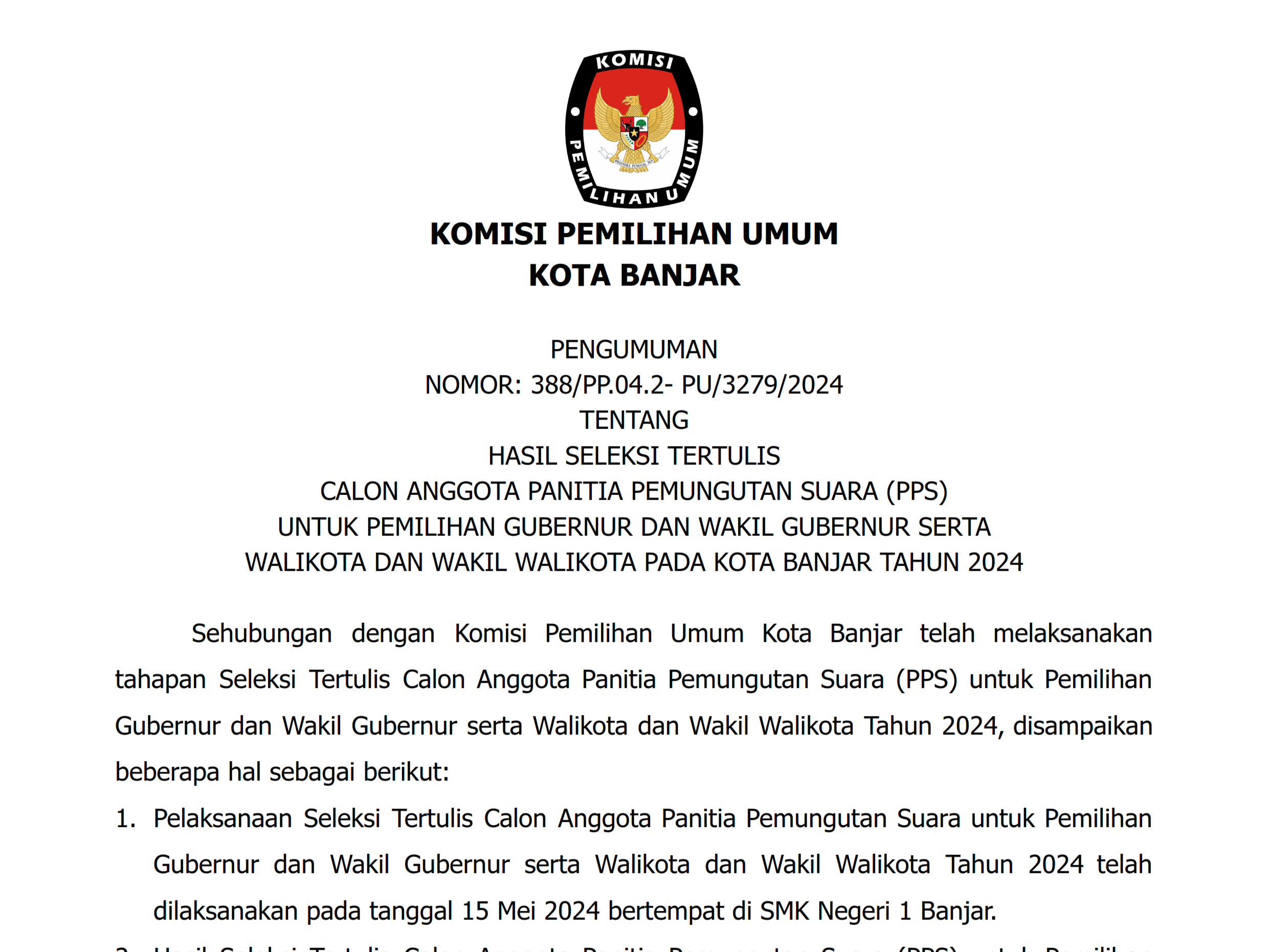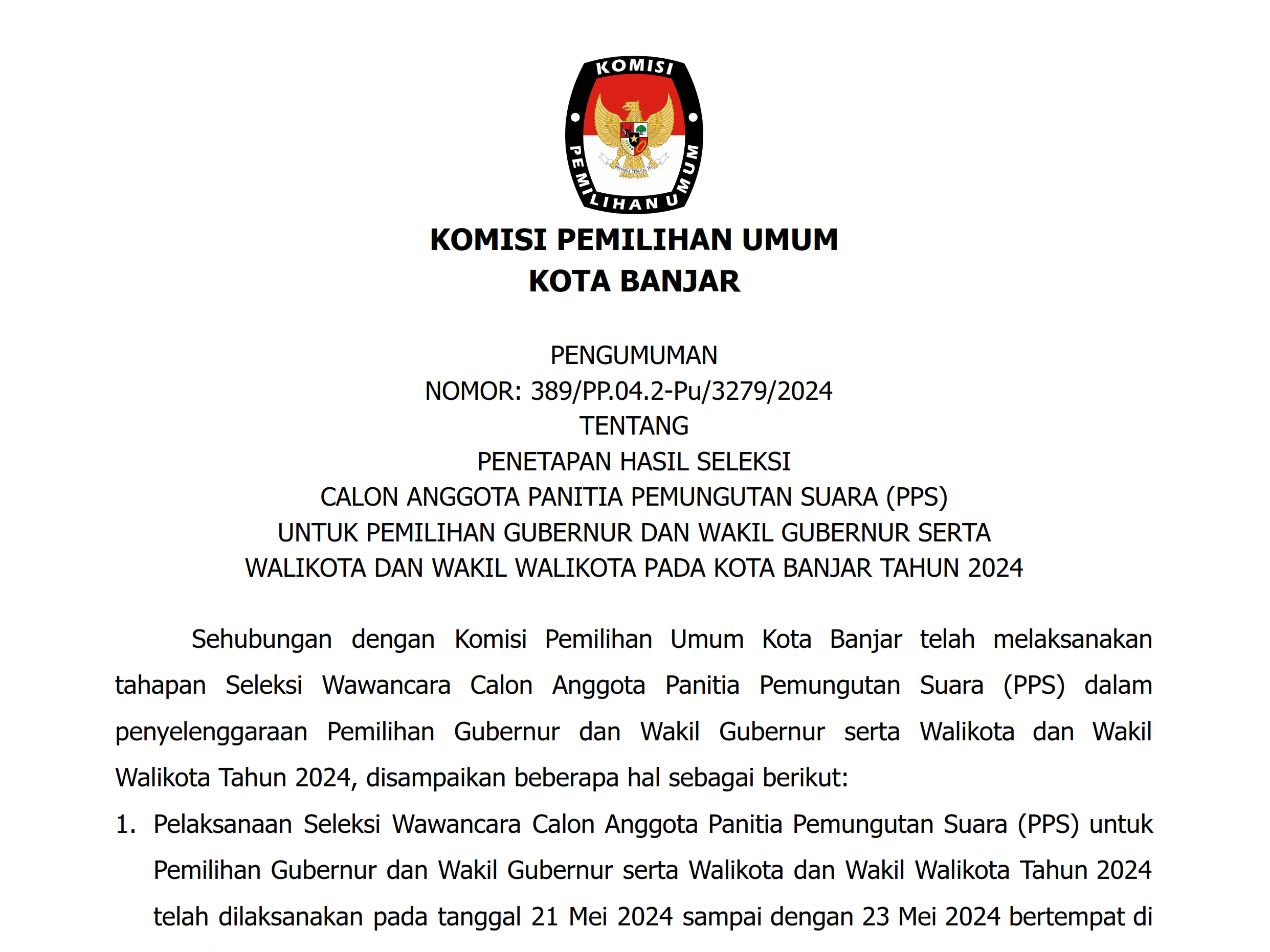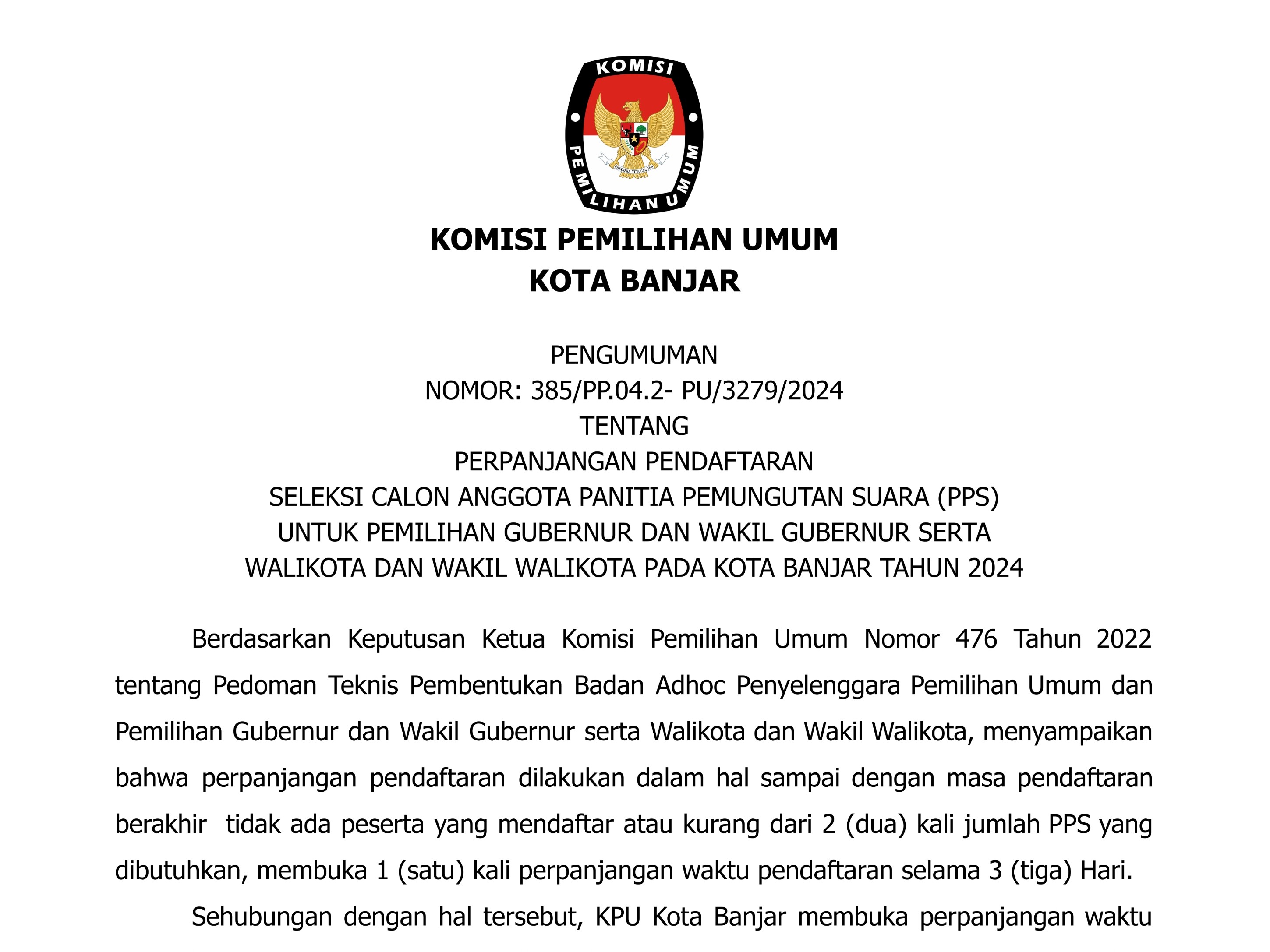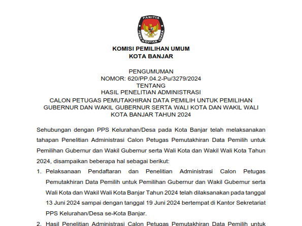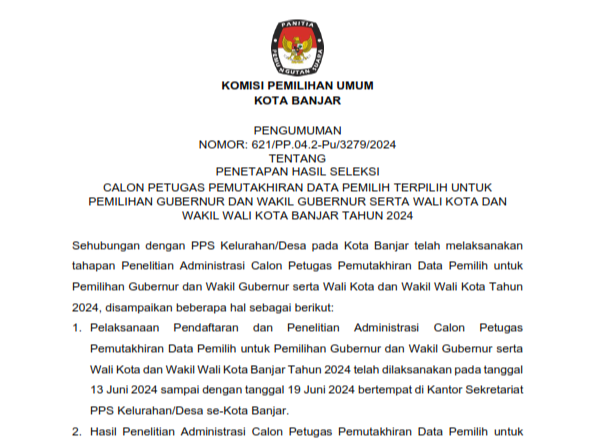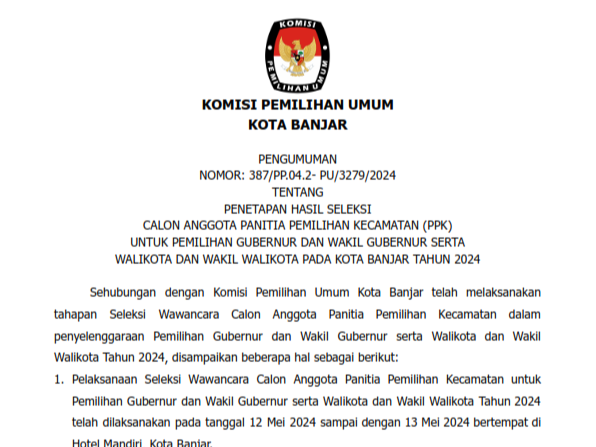 Berikut Pengumuman Nomor: 385/PP.04.2-Pu/3279/2024 Tentang Perpanjangan Pendaftaran Seleksi Calon Anggota Panitia Pemungutan Suara (PPS) Untuk Pemilihan Gubernur Dan Wakil Gubernur Serta Walikota Dan Wakil Walikota Pada Kota Banjar Tahun 2024.