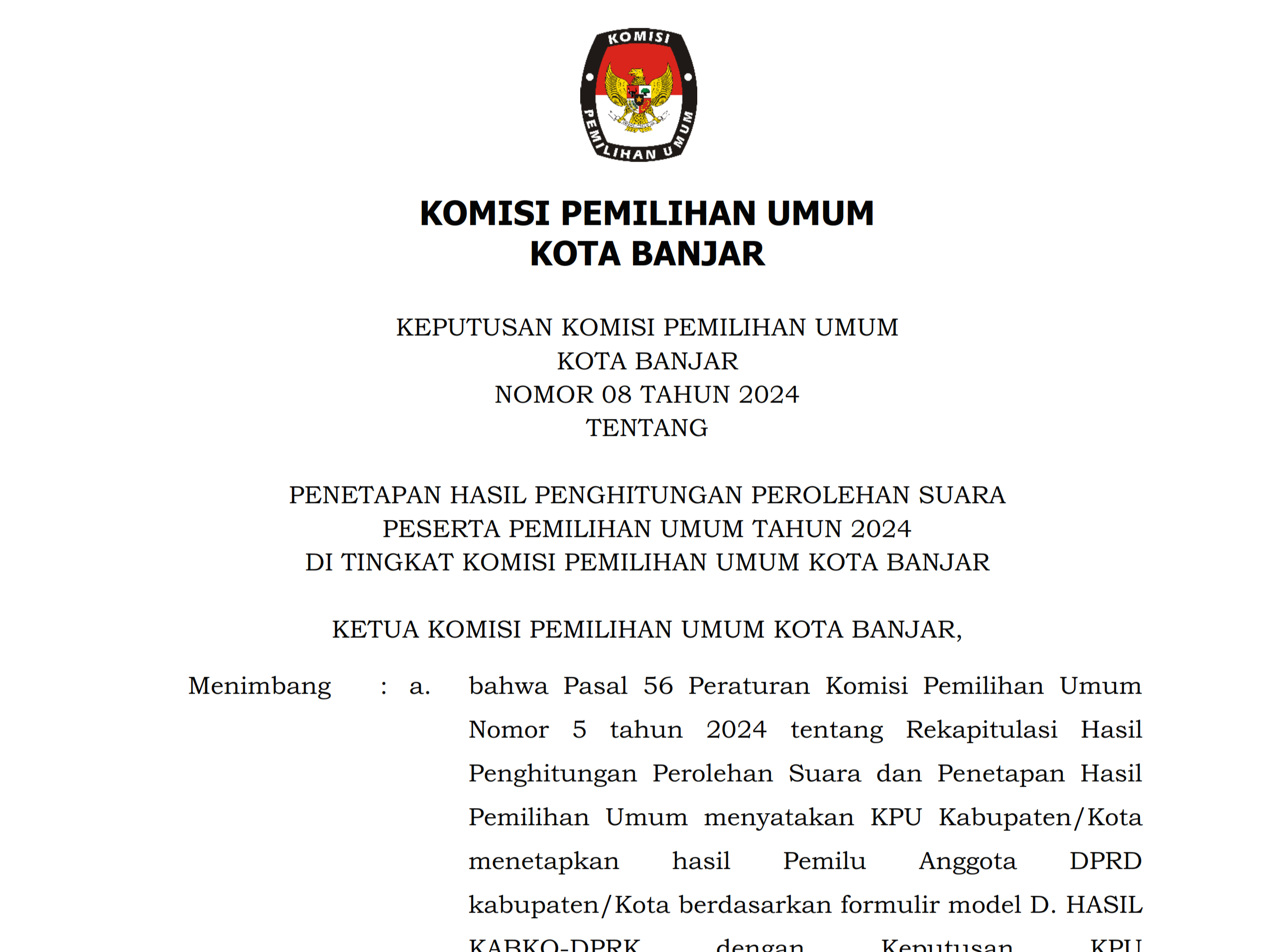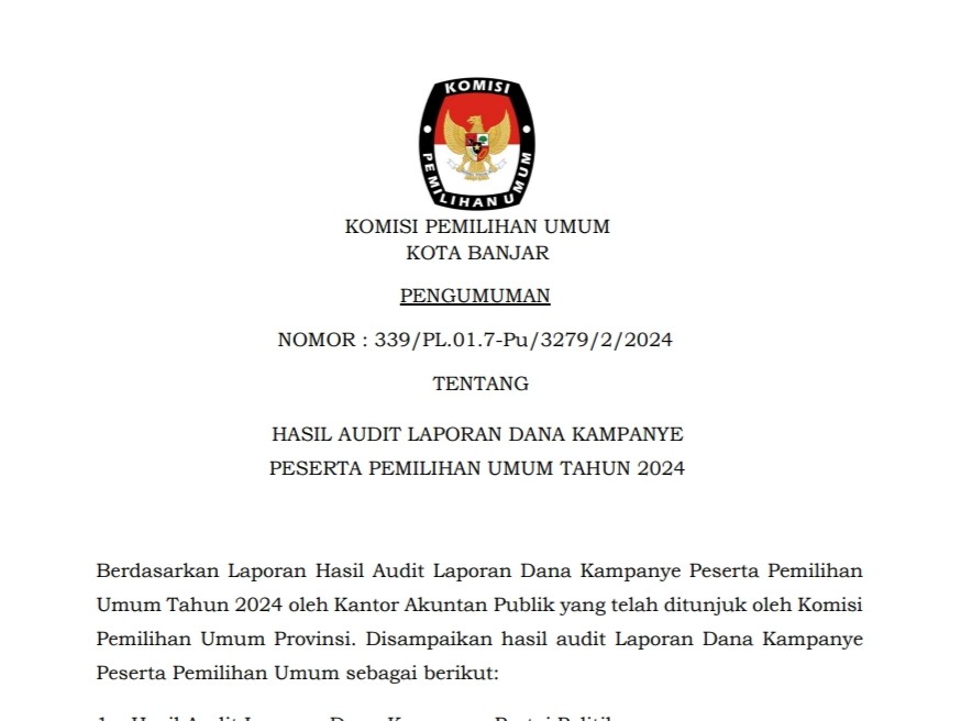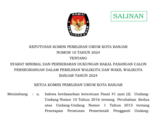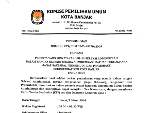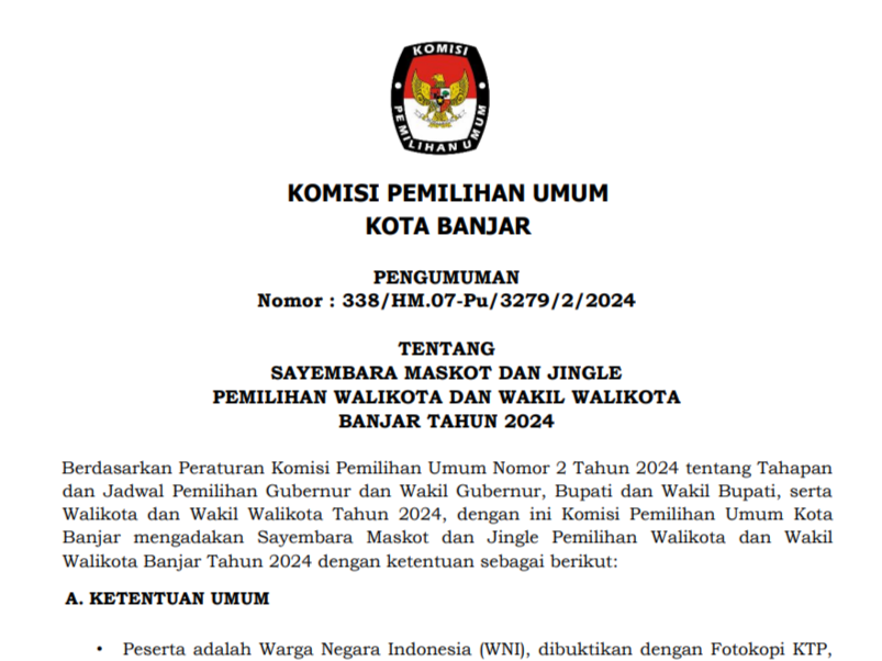 Berdasarkan Peraturan Komisi Pemilihan Umum Nomor 2 Tahun 2024 tentang Tahapan dan Jadwal Pemilihan Gubernur dan Wakil Gubernur, Bupati dan Wakil Bupati, serta Walikota dan Wakil Walikota Tahun 2024, dengan ini Komisi Pemilihan Umum Kota Banjar mengadakan Sayembara Maskot dan Jingle Pemilihan Walikota dan Wakil Walikota Banjar Tahun 2024 dengan ketentuan sebagai berikut::