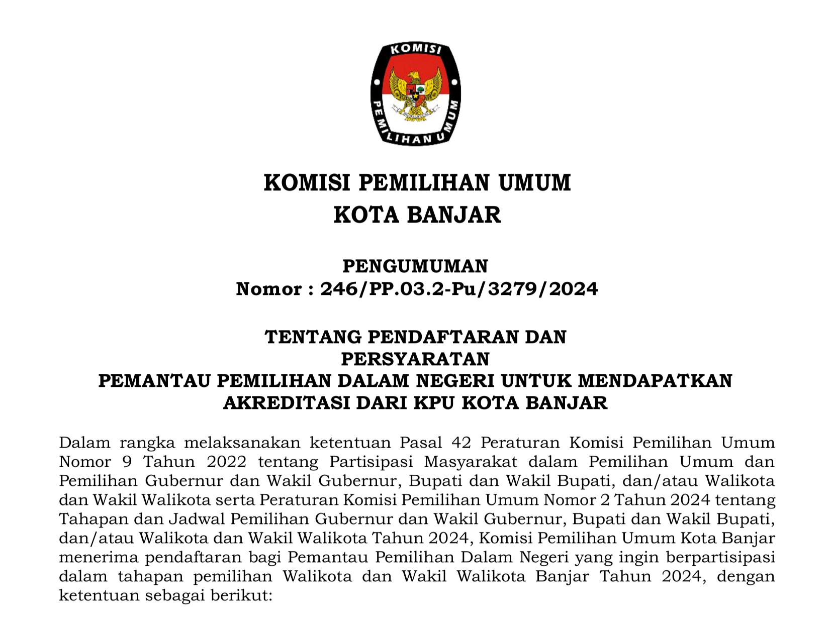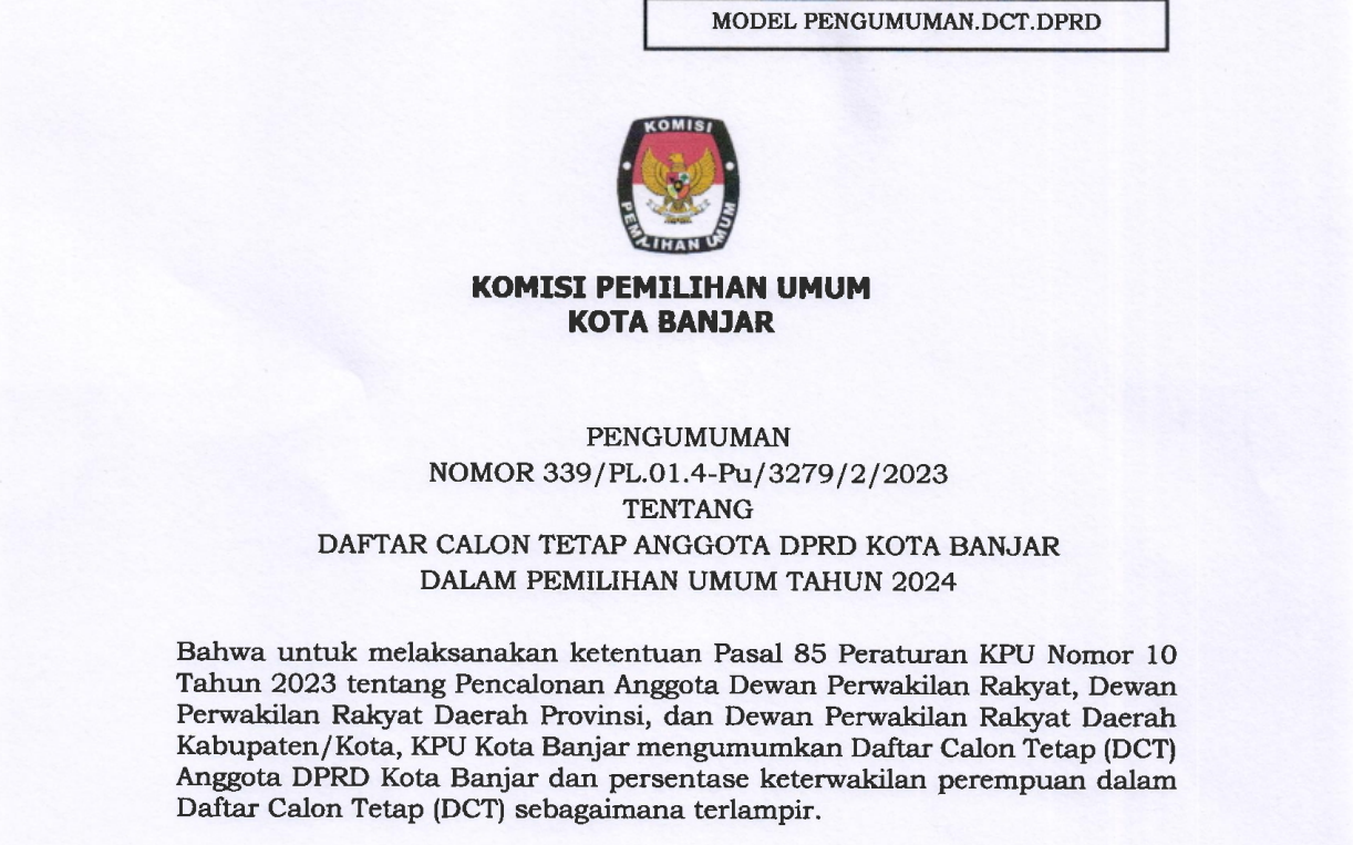 Berdasarkan ketentuan Pasal 85 ayat (1) Peraturan KPU Nomor 10 Tahun 2023 tentang Pencalonan Anggota Dewan Perwakilan Rakyat, Dewan Perwakilan Rakyat Daerah Provinsi, dan Dewan Perwakilan Rakyat Daerah Kabupaten/Kota. KPU Kota Banjar telah mengumumkan Daftar Calon Tetap (DCT) Anggota DPRD Kota Banjar dan persentase keterwakilan perempuan dalam Daftar Calon Tetap (DCT) pada Pemilu Tahun 2024.