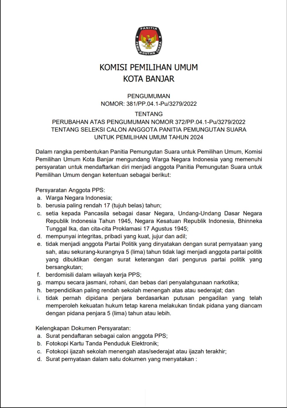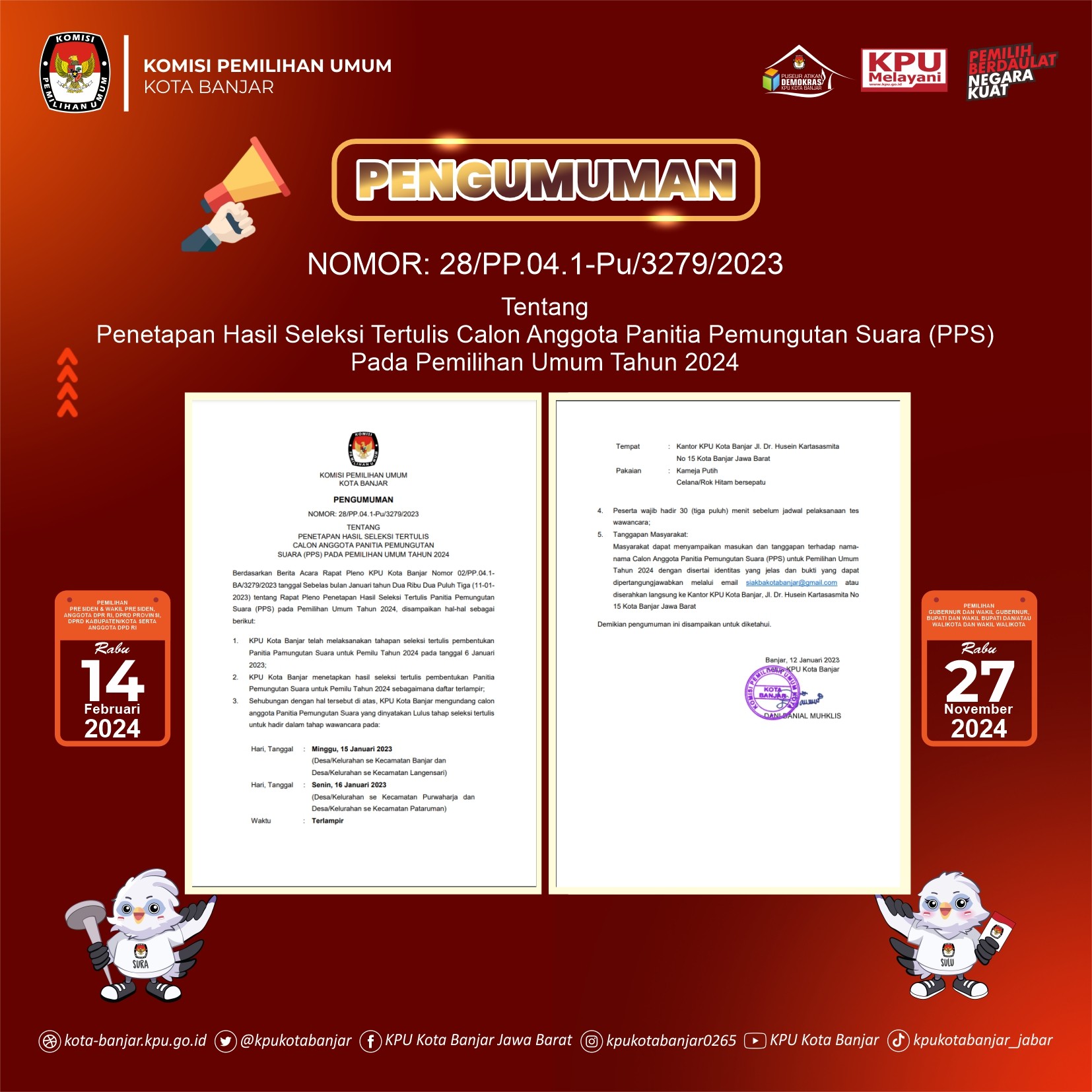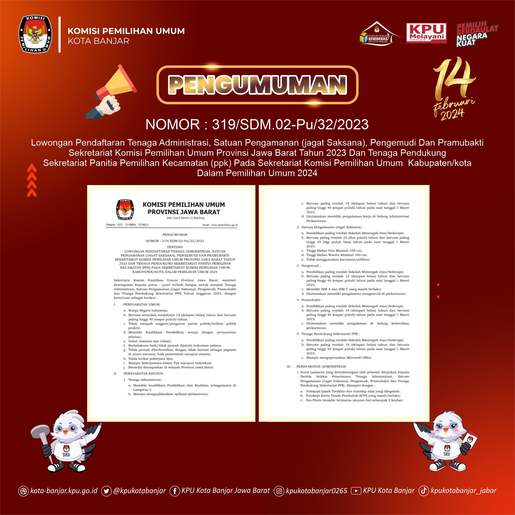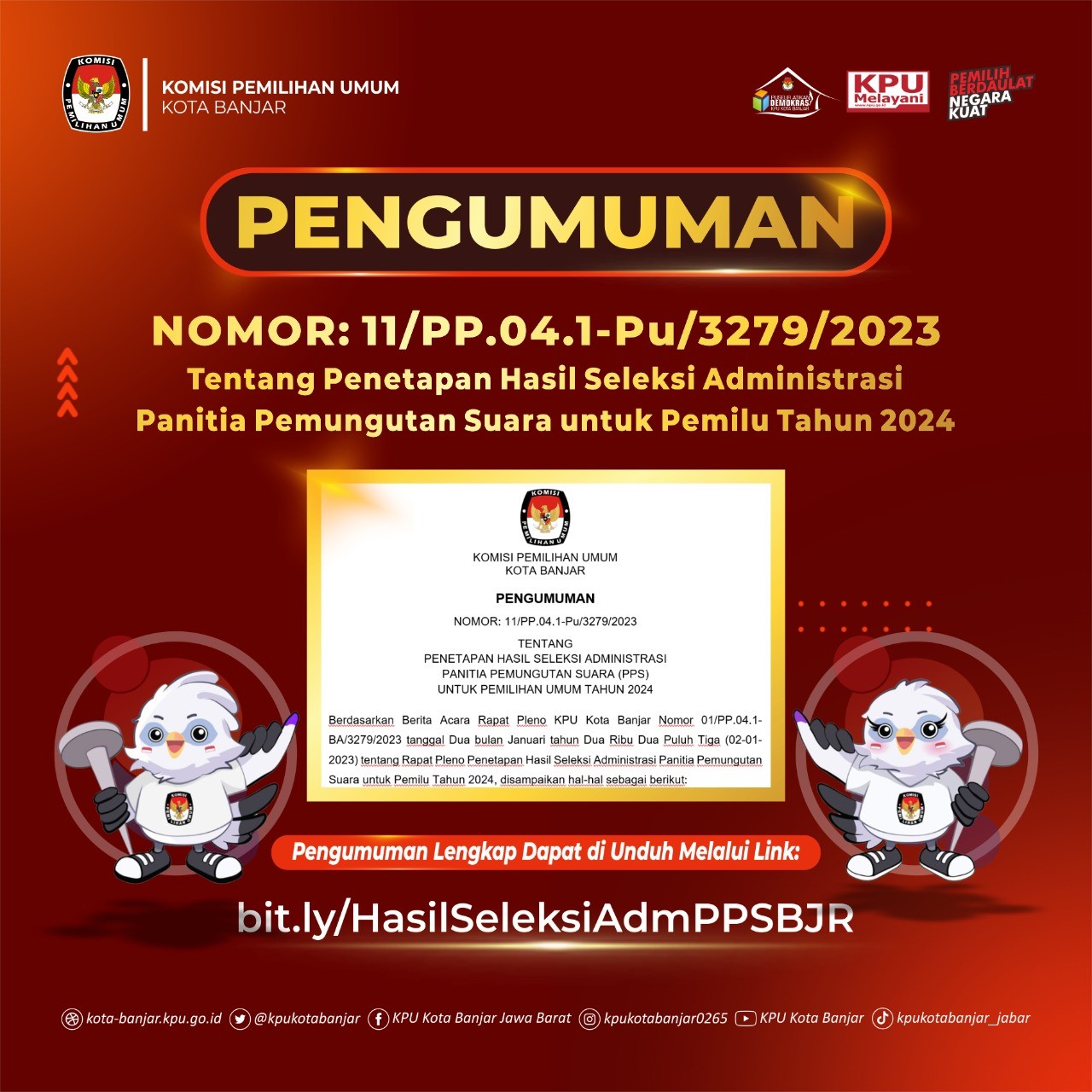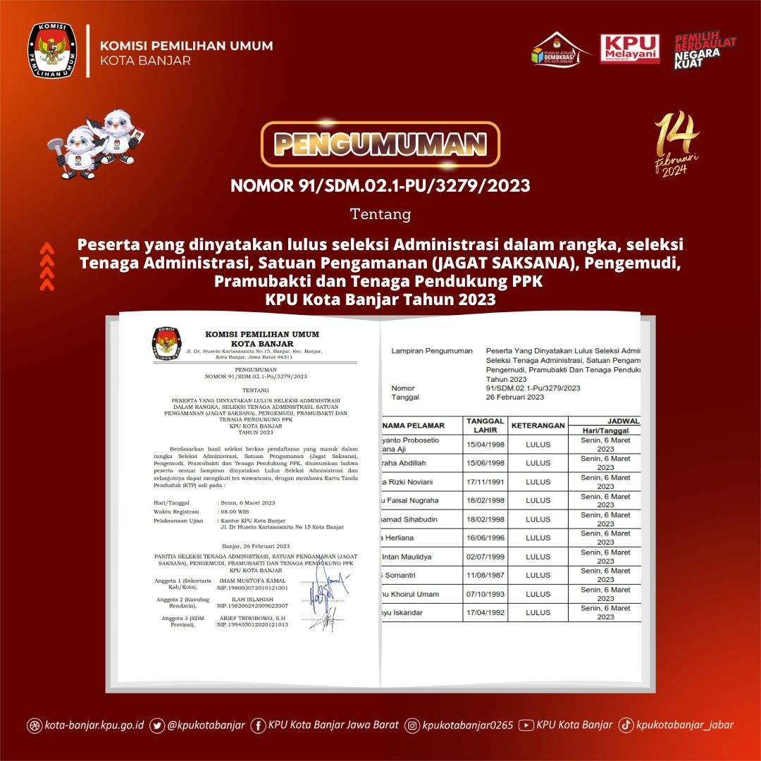 Berikut ini PENGUMUMAN PESERTA YANG DINYATAKAN LULUS SELEKSI ADMINISTRASI DALAM RANGKA, SELEKSI TENAGA ADMINISTRASI, SATUAN PENGAMANAN (JAGAT SAKSANA), PENGEMUDI, PRAMUBAKTI DAN TENAGA PENDUKUNG PPK KPU KOTA BANJAR TAHUN 2023.